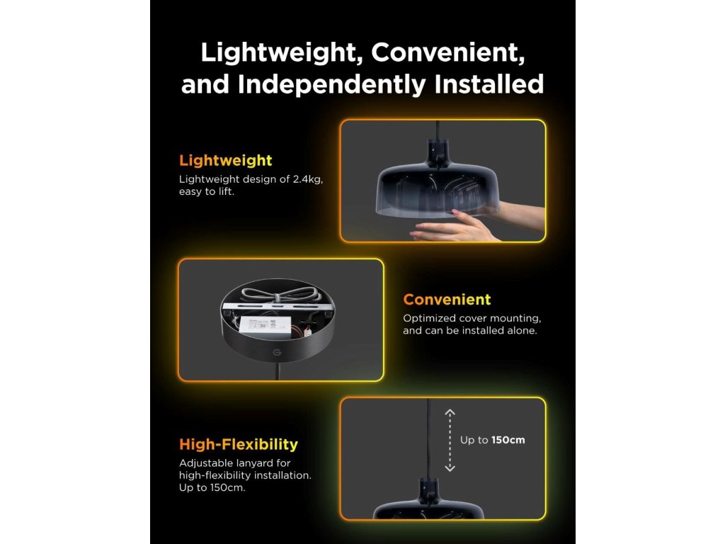 Závesné svietidlo Govee je vybavené trojzónovým kruhovým osvetlením, ktoré poskytuje 360° osvetlenie s možnosťou nezávislého ovládania každej zóny. Svetlo je nastaviteľné od teplej bielej 2700 K po studenú 6500 K a ponúka vysoký index podania farieb (CRI 95). Inštalácia lustra je jednoduchá a vďaka nastaviteľnému závesnému káblu až do dĺžky 150 cm ho môžete ľahko prispôsobiť výške vášho stropu.