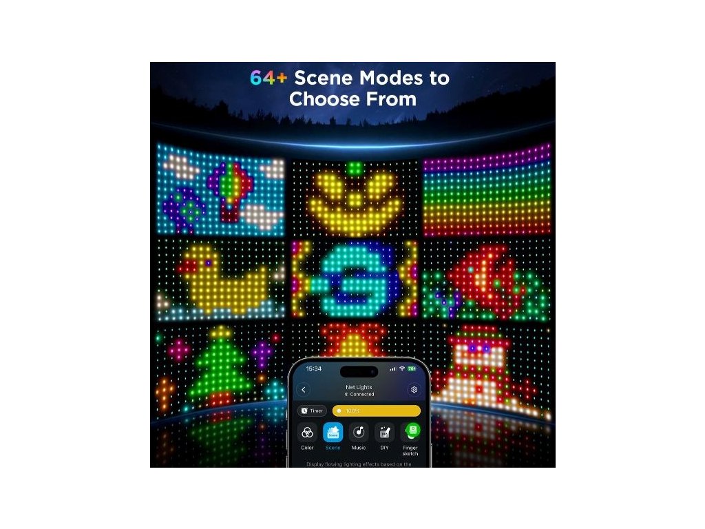 Sieť ponúka viac než 64 dynamických scénických režimov, ktoré vám umožnia vytvoriť dokonalú atmosféru pre každú príležitosť. Tieto prednastavené svetelné scény zahŕňajú širokú škálu efektov, od jemných a upokojujúcich prechodov až po pulzujúce a živé vzory, ktoré sú ideálne na oslavy, sviatočné dekorácie alebo každodenné osvetlenie. Či už chcete navodiť relaxačnú večernú náladu, alebo rozprúdiť energiu na záhradnej párty, vždy nájdete scénu, ktorá bude presne odpovedať vašim potrebám. Tieto scény sú navyše plne prispôsobiteľné, takže si môžete ľahko upraviť farby a intenzitu osvetlenia podľa svojho vkusu.