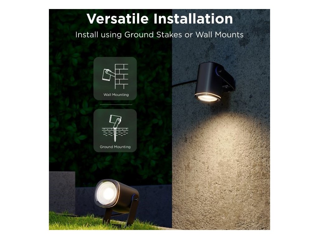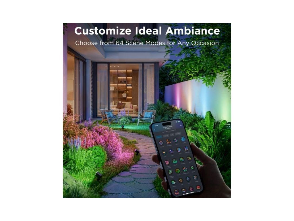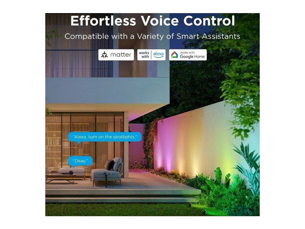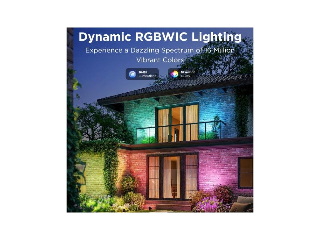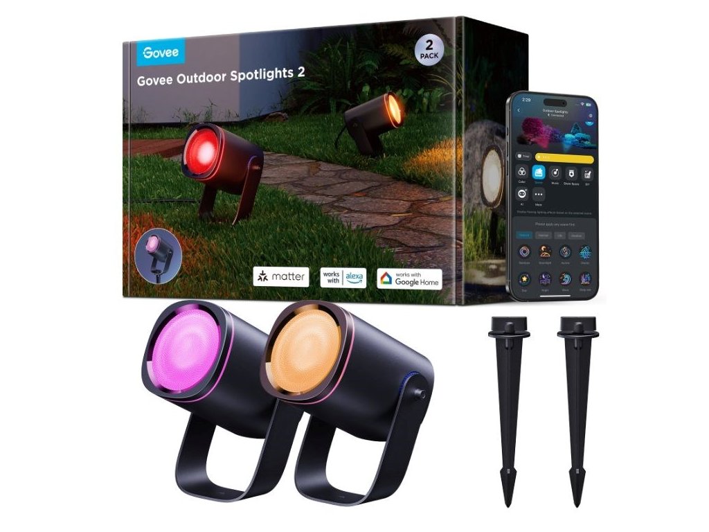 Energeticky úsporné záhradné reflektory so svetelným výkonom 750 lm urobia z vašej záhrady dizajnový skvost. Vďaka technológii RGBICWW dokážu zobraziť až 16 miliónov farieb a ponúkajú aj biele spektrum od 2700 do 6500 K. Na výber máte určite viac ako 50 režimov osvetlenia a pri počúvaní obľúbenej hudby si môžete vybrať aj zo 6 režimov rytmu. Alebo si jednoducho nastavte vlastné farebné kombinácie podľa svojich predstáv na každom z nich. Príkazy môžete zadávať aj hlasom prostredníctvom Siri, Amazon Alexa alebo Google Assistant, prípadne prostredníctvom aplikácie Govee Home v smartfóne alebo tablete. Nové svetlá podporujú technológiu Matter, takže natívne podporujú aj Apple Homekit. Svetlo má celkovú dĺžku takmer 16 metrov a veľmi ľahko sa inštaluje. Pomocou časovača môžete svetlá automaticky zapínať a vypínať na základe západu a východu slnka. Svetlá majú stupeň vodotesnosti IP67 (okrem napájacieho adaptéra) s prevádzkovou teplotou od -20 °C do 40 °C.