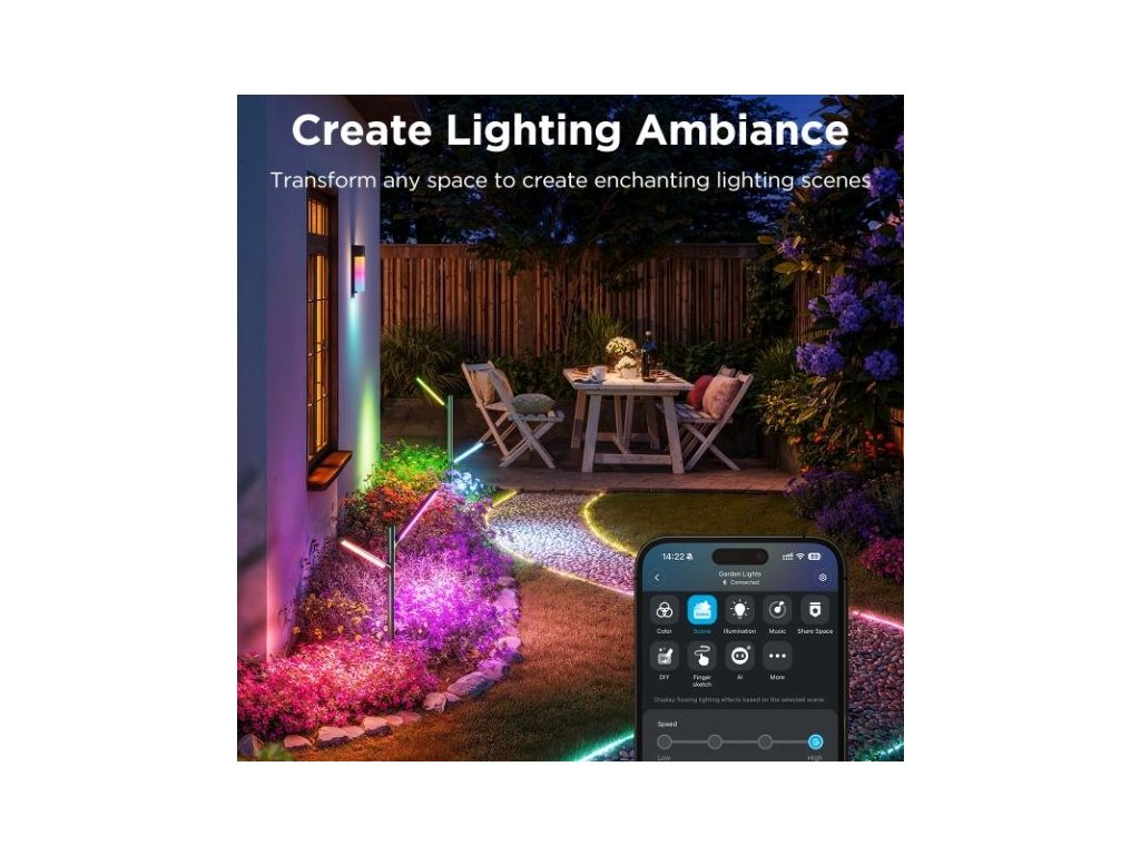 Vďaka ovládaniu cez inteligentnú aplikáciu Govee si môžete vybrať z viac ako 16 miliónov farieb RGB, ako aj z dokonalých odtieňov bielej vďaka LED diódam s teplým a studeným svetlom. Atmosféru vo vašej záhrade, na terase alebo balkóne tak môžete doladiť k dokonalosti - či už ide o jemné, relaxačné tóny alebo výrazné, dynamické svetelné efekty. Desiatky scén a režim vlastného dizajnu v aplikácii vám pomôžu vytvoriť požadovanú náladu. Vďaka podpore Matter možno navyše svetlá ľahko integrovať do systému inteligentnej domácnosti a ovládať ich hlasom prostredníctvom obľúbených asistentov.