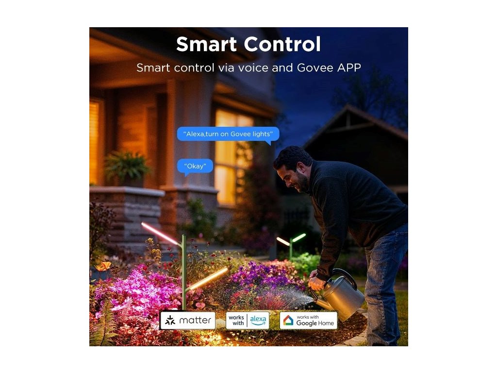 Vonkajšie osvetlenie Govee podporuje najmodernejší štandard Matter, ktorý umožňuje jednoduchú a bezproblémovú integráciu do inteligentnej domácnosti. Vďaka tejto technológii môžete svetlá ovládať hlasovými príkazmi prostredníctvom populárnych asistentov, ako sú Amazon Alexa alebo Google Home. Stačí jedno slovo a svetlá sa rozsvietia, zmenia farbu alebo zapnú vašu obľúbenú scénu. Pohodlné a intuitívne ovládanie tak prináša maximálne pohodlie a slobodu pre vaše vonkajšie osvetlenie.