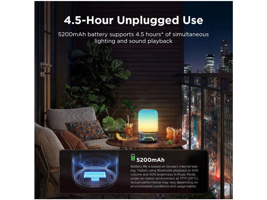Vstavaná batéria s kapacitou 5200 mAh poskytuje až 4,5 hodiny bezdrôtového prevádzky pri polovičnom jasu a hlasitosti. Môžete ju vziať kamkoľvek – do záhrady, na piknik alebo na párty s priateľmi. Vďaka tomu, že nie ste viazaní na elektrickú zásuvku, máte úplnú flexibilitu.