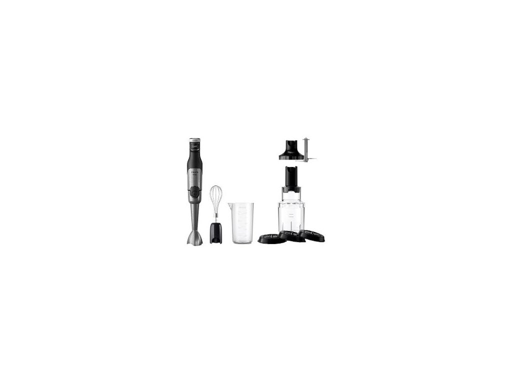 Tyčový mixér so silným motorom s príkonom 1200 W mixuje a strúha do tvaru zábavných ozdobných špirál. Rýchle a efektívne mixovanie stlačením jedného tlačidla. Technológia ProMix pre najlepšie výsledky v priebehu pár sekúnd. Turbo funkcia pre extra výkon. Kovová mixovacia noha odnímateľná jedným tlačidlom. Špeciálny tvar krytu čepele zabraňuje rozstrekovaniu a neporiadku pri mixovaní. LED display. Príslušenstvo: transparentná mixovacia nádoba, šľahač, sekáčik, špiralizér.Dodatočné parametre