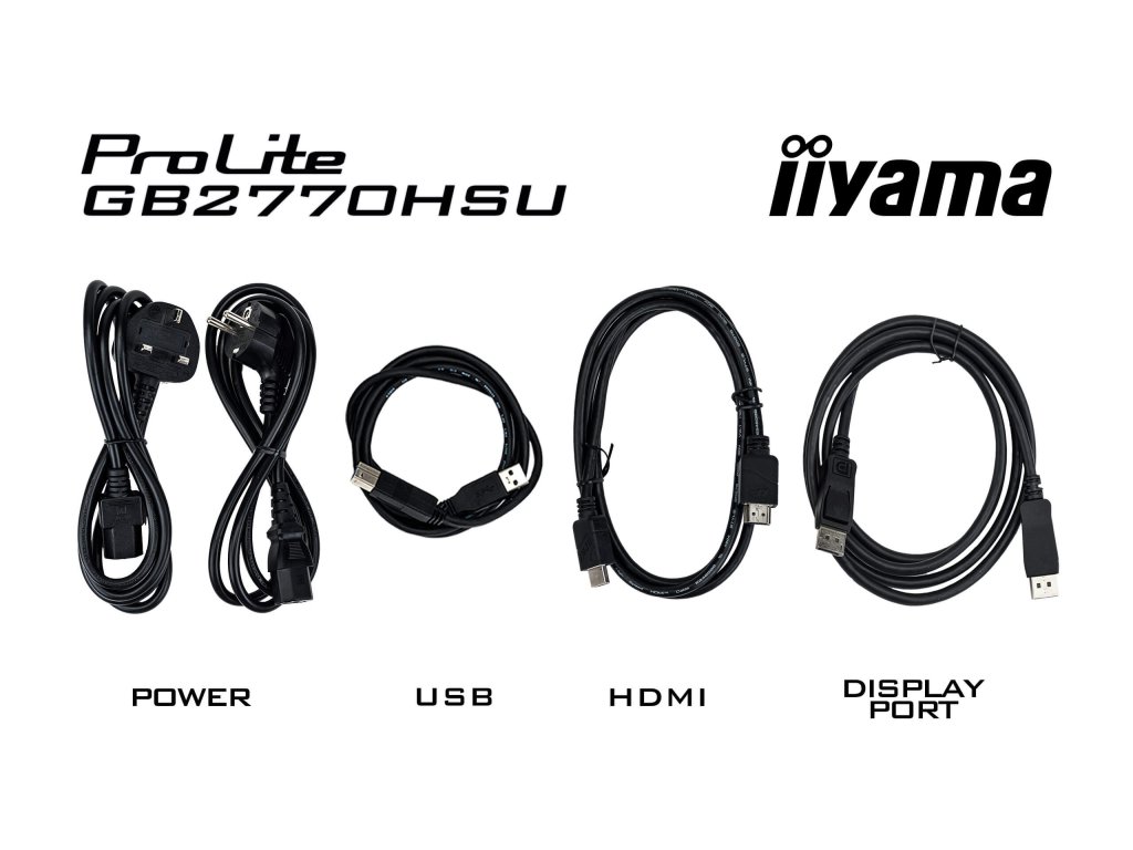 * Kabely: napájecí, USB, HDMI, DP