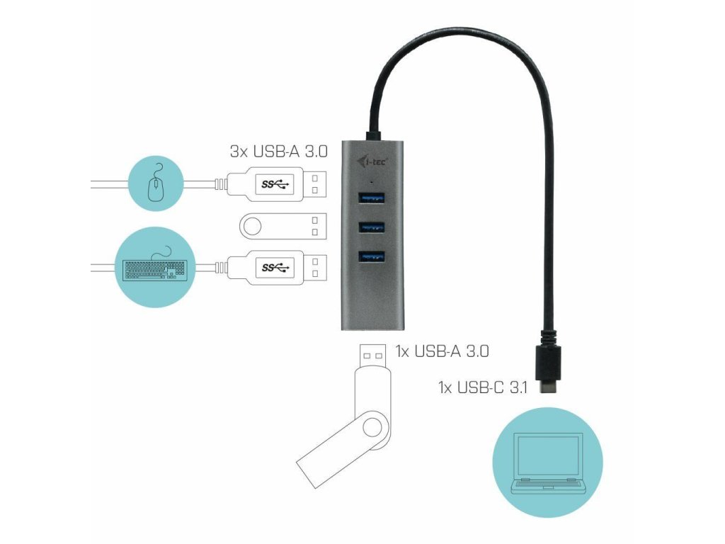 -i-tec USB-C 3.1 kovový HUB 4 Port s integrovaným káblom USB-C (20 cm)