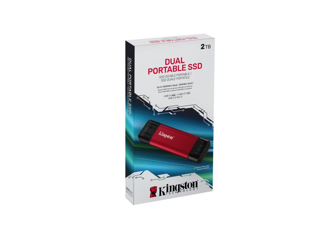 Přenosný SSD disk Dual Portable SSD od společnosti Kingston, maskovaný jako tradiční flash disk, přináší ohromující výkon USB 3.2 Gen 2 do vašich zařízení USB typu A a USB-C®. Tento přenosný SSD disk posouvá „pohodlí“ na zcela novou úroveň díky kompaktnímu a odolnému kovovému designu a konektorům USB typu A i typu C, které umožňují snadný přenos souborů mezi notebooky, stolními počítači, mobilními zařízeními a dalšími zařízeními. Zvyšte svou produktivitu na místě díky přenosovým rychlostem až 1 050 MB/s při čtení a 950 MB/s při zápisu.Rozhraní: USB typ A + USB typ C