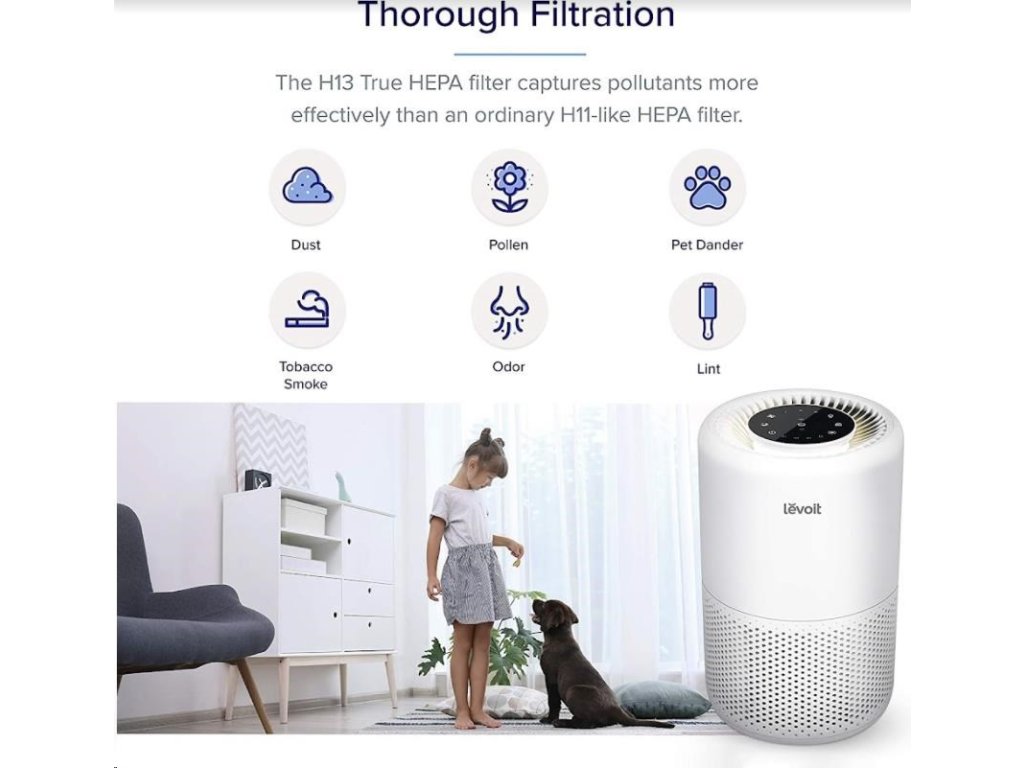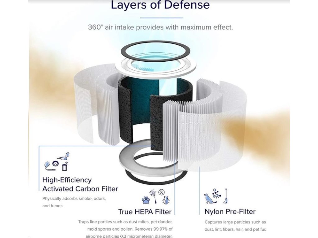 Druhou vrstvou je HEPA filter H13. To odlišuje Levoit od konkurencie, pretože filter HEPA H13 je oveľa kvalitnejší a spoľahlivejší ako bežne používané HEPA H11. Tu sa odfiltrujú jemné prachové častice, pleseň, baktérie, peľ, dymové častice, roztoče a srsť.