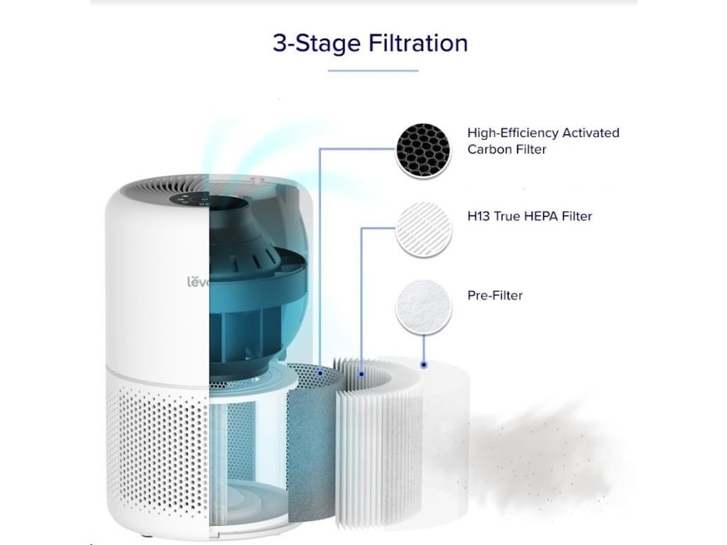 Druhou vrstvou je HEPA filter H13. To odlišuje Levoit od konkurencie, pretože filter HEPA H13 je oveľa kvalitnejší a spoľahlivejší ako bežne používané HEPA H11. Tu sa odfiltrujú jemné prachové častice, pleseň, baktérie, peľ, dymové častice, roztoče a srsť.