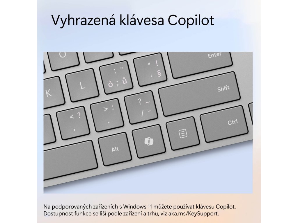 klávesnice Microsoft Surface Keyboard (2. edice) Díky klávese Copilota u klávesnice pro Surface máte ve Windows 11 výhody umělé inteligence na dosah ruky. Tahle elegantní klávesnice umožňuje klasické psaní se zabudovanou numerickou částí a vyhrazenými klávesami pro rychlý přístup k funkcím výstřižky a skica, expresivní vstup, ztlumení hovoru a dalším. Rozměry: 420,9 × 112,6 × 19,3 mm Hmotnost: 419,3 g (s bateriemi) Rozhraní: Bluetooth Low Energy 4.0 Dosah: 10 m ve volném prostoru, až 5 m v typickém kancelářském prostředí Napájení: 2× AAA (součást balení) Výdrž baterií: až 1 rok Barva: šedá Klávesy: * QWERTZ (CZ&SK) * multimediální klávesy: základní (zvýšení/snížení hlasitosti, ztlumení, přehrávání/pozastavení, převinutí zpět/vpřed) * klávesa Copilot pro Windows, Expresivní vstup, Výstřižky/Snímek obrazovky, Ztlumení hovoru a Widgety * funkce šifrování: AES přes Bluetooth LE SSP nebo klíč Kompatibilita: Windows, Android, mac OS X, iOS Odkaz na stránky výrobce a informace o produktu: https://www.microsoft.com/cs-cz/d/klavesnice-surface-keyboard-2-edice/93d9l5tctr0bDodatočné parametre