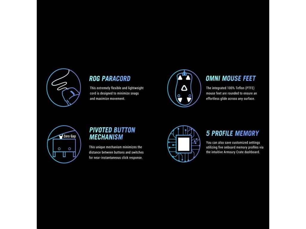 - ROG Micro Switches - Nové ROG Micro Switches majú životnosť 70 miliónov kliknutí a pozlátený elektrospoj na zvýšenie odolnosti. Prísne výrobné štandardy ROG zaručujú, že každý jednotlivý spínač je skontrolovaný a roztriedený, pričom sa spájajú ľavý a pravý spínač, aby sa udržala odchýlka sily v rozmedzí +/- 5 gramov pre konzistentný pocit kliknutia.