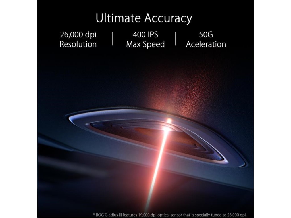 - Revolučný výkon - ROG Gladius III je vybavený optickým snímačom s rozlíšením 19 000 dpi a odchýlkou 1 % (vyladeným na 26 000 dpi) pre takmer nulovú latenciu a bezkonkurenčnú presnosť. Jej ergonomický tvar poskytuje pohodlie pri maratónskych herných seansách a jedinečná konštrukcia Push-Fit Switch Socket II zaručuje kompatibilitu s mechanickými aj optickými mikrospínačmi Omron. Medzi dokončovacie prvky patrí flexibilný ROG Paracord a zaoblené nožičky zo 100 % TPFE pre mimoriadne hladký sklz a laserom vygravírované značky ROG s osvetlením RGB na textúrovanom, protišmykovom bočnom paneli.