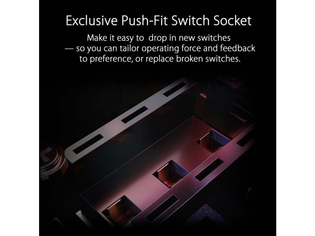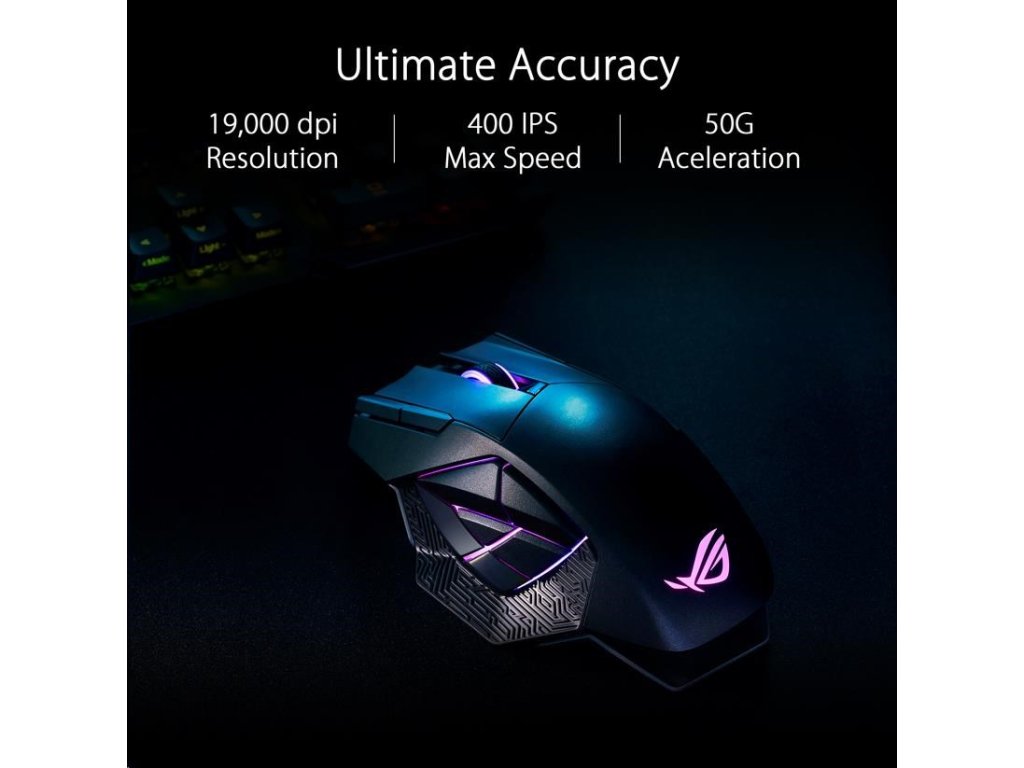- ROG Micro Switch - ROG Micro Switch je vybavený pozláteným elektrospojom a životnosťou 70 miliónov kliknutí, čo zvyšuje odolnosť a predlžuje životnosť myši. Prísne výrobné štandardy ROG zaručujú, že každé tlačidlo myši si zachováva odchýlku sily v rozmedzí +/- 5 gramov pre konzistentný pocit z kliknutia.