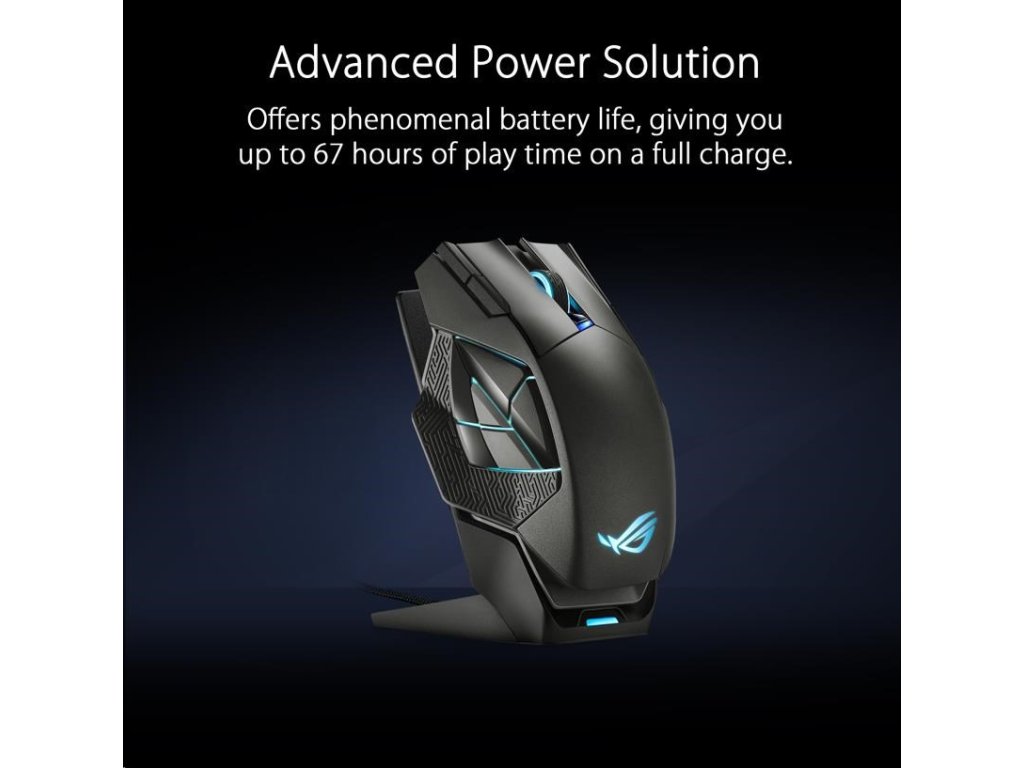 - Pokročilé riešenie napájania - ROG Spatha X ponúka fenomenálnu výdrž batérie, vďaka ktorej môžete na plné nabitie hrať až 67 hodín. A ak sa batéria vybije, stačí 15 minút nabíjania cez USB-C alebo nabíjací dok, aby ste mohli hrať až 12 hodín* intenzívneho bezdrôtového hrania.
