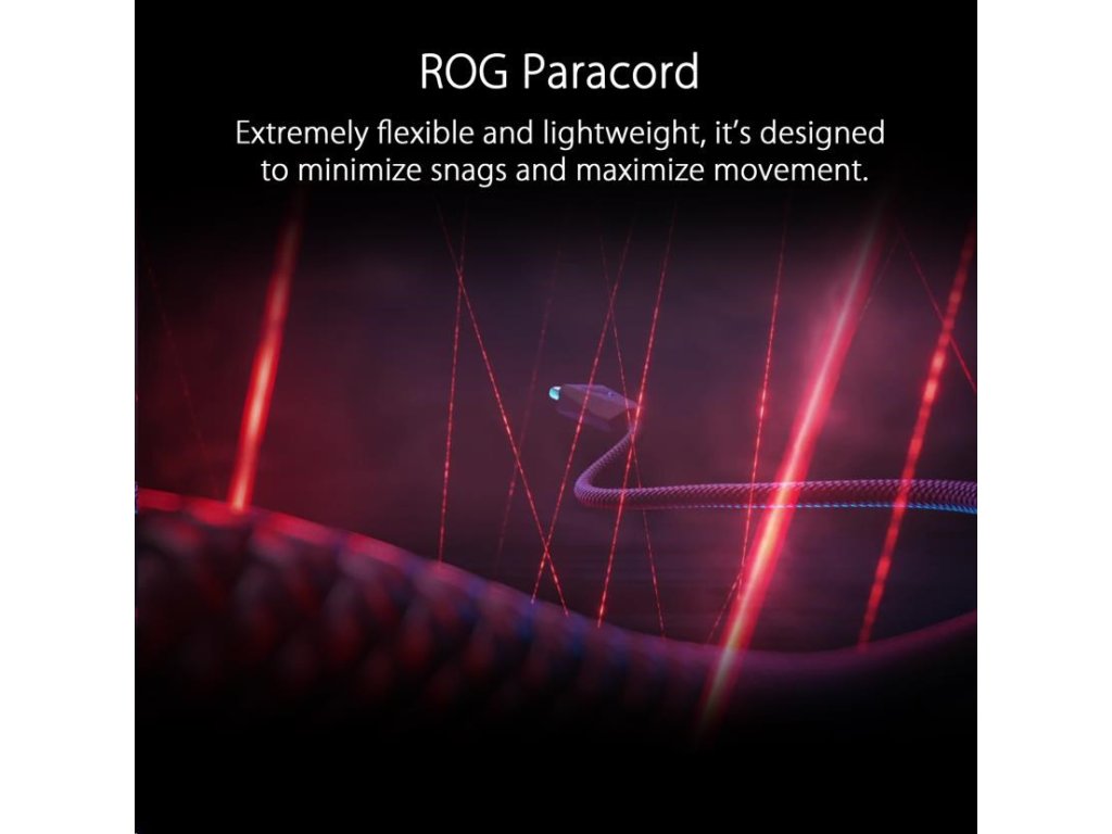 - ROG Paracord - Extrémne flexibilný a ľahký ROG Paracord je navrhnutý tak, aby minimalizoval zasekávanie a maximalizoval pohyb. Vyvýšený port ROG Spatha X poskytuje priestor medzi káblom a povrchom dosky alebo podložky pod myš, čím minimalizuje ťahanie kábla a hluk.