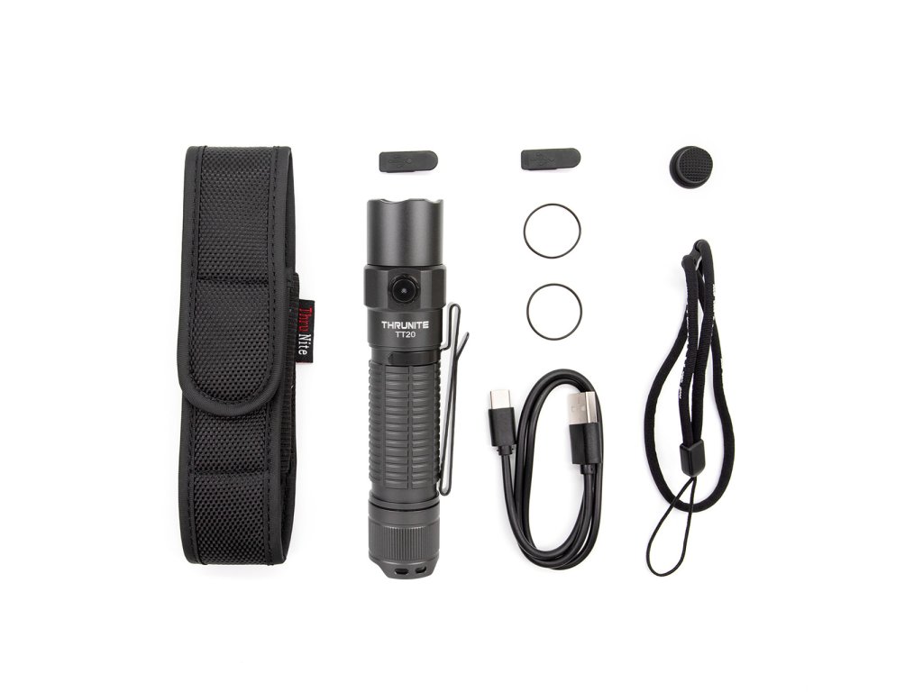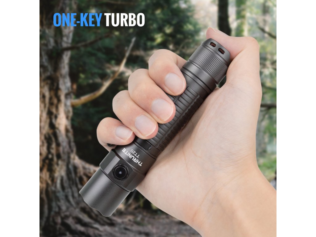 ThruNite TT20 (farebné prevedenie Metal Grey) je taktické svietidlo s výkonom až 2526 lumen a dosvitom až 258 metrov. Výkon generuje čip Luminus SST70 napájaný vysokokapacitným akumulátorom Li-Ion 21700 (5000mAh), ktorý je súčasťou balenia. Dobíjanie prebieha cez USB-C konektor, integrovaný do tela svietidla. Ovládanie so zadným a bočným spínačom. Bočný spínač je plne programovateľný (čo znamená, že si môžete plynulo nastaviť požadovaný výkon v lm a toto tlačítko si túto voľbu zapamätá), zatiaľ čo taktický zadný spínač umožňuje okamžitý prístup k turbo režimu jediným kliknutím. TT20 je super výkonné malé svietidlo pre taktické účely (zabezpečenie objektov, bezpečnostné zložky, poľovníctvo a pod.) alebo pre každodenné univerzálne využitie.