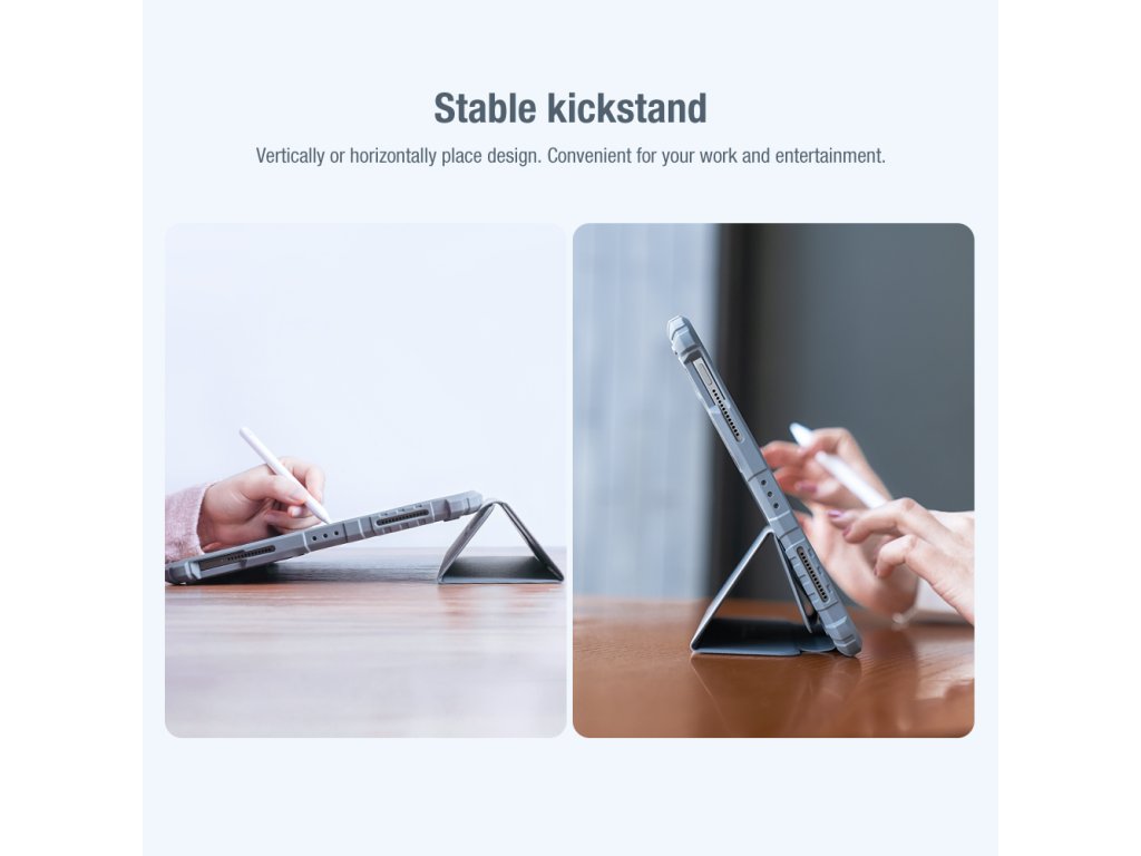 Popis produktu: Nillkin Bumper Pro ochranné pouzdro s praktickým flipem, který slouží zároveň jako stojánek je vyrobeno z vybraného materiálu TPU a PC. Čočka fotoaparátu je chráněna posuvným krytem Zajišťuje dokonalou ochranu a funkčnost. Zesílené rohy perfektně ochrání hrany tabletu. Flip krytu je z PU kůže. Unikátní skládací kryt zobrazuje iPad ve všech zvolených úhlech pro psaní, čtení a prohlížení webu. Složení krytu je velmi jednoduché. Vestavěná sestava magnetů podporuje funkce iPad pro automatické probuzení / spánek. V pouzdře najdete prostor pro vaši Apple tužku. Vlastnosti - transparentní PC zadní strana - TPU rámeček - posuvný kryt zadního fotoaparátu - přední strana z umělé kůže - ochranný kryt - přesné výřezy na fotoaparát, konektory, reproduktory - kompletní ochrana - kvalitní provedení