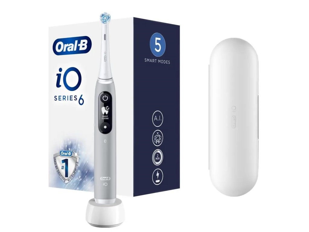 Oral-B iO Series 6 Grey Opal elektrický zubní kartáček, magnetický, 5 režimů, tlakový senzor, AI, pouzdro