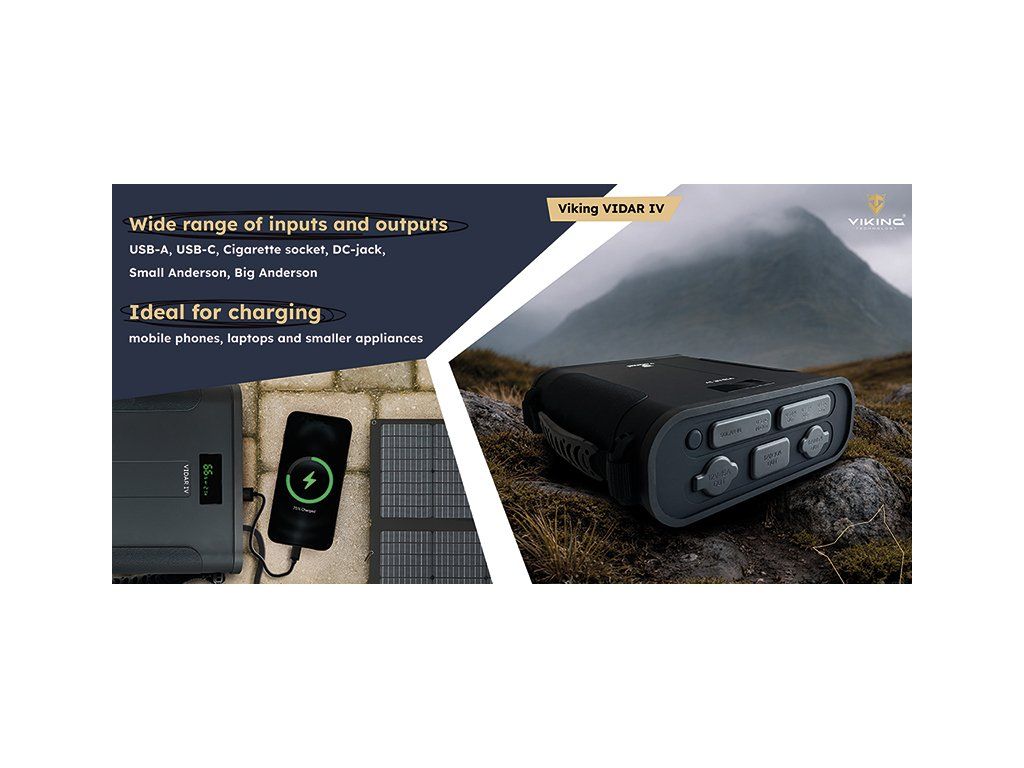 Outdoorová powerbanka Viking VIDAR IV • Kapacita: 144000mAh/460.8Wh • LED displej • Maximální výkon: 360W • Zabudované LED světlo • Široká škála vstupů a výstupů (USB-A, USB-C, Cigaretová zásuvka, DC-jack, Small Anderson, Big Anderson) • Možnost solárního napájení