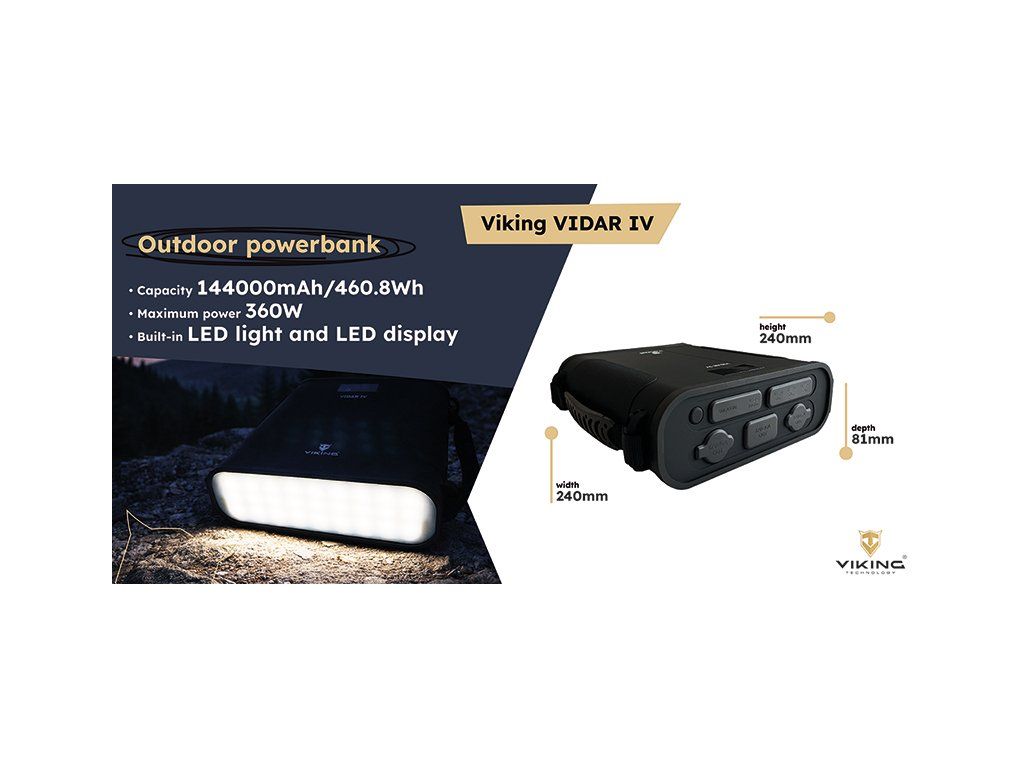 Outdoorová powerbanka Viking VIDAR IV Outdoorová powerbanka Viking VIDAR IV je spolehlivý a odolný záložní zdroj energie navržený pro náročné podmínky. Díky robustní konstrukci, vysoké kapacitě a širokému výběru konektorů je ideální pro kempování, práci v terénu i cestování. Jedná se o zatím nejsilnější model z celé série – nabízí ohromující kapacitu 144000 mAh (460,8 Wh) a maximální výkon až 360W, což z něj činí ideální řešení pro dlouhodobé pobyty mimo civilizaci. Je vybaven výstupy USB-A (2x), USB-C (2x), dvěma cigaretovými zásuvkami (12V) a výkonným Big Anderson portem.