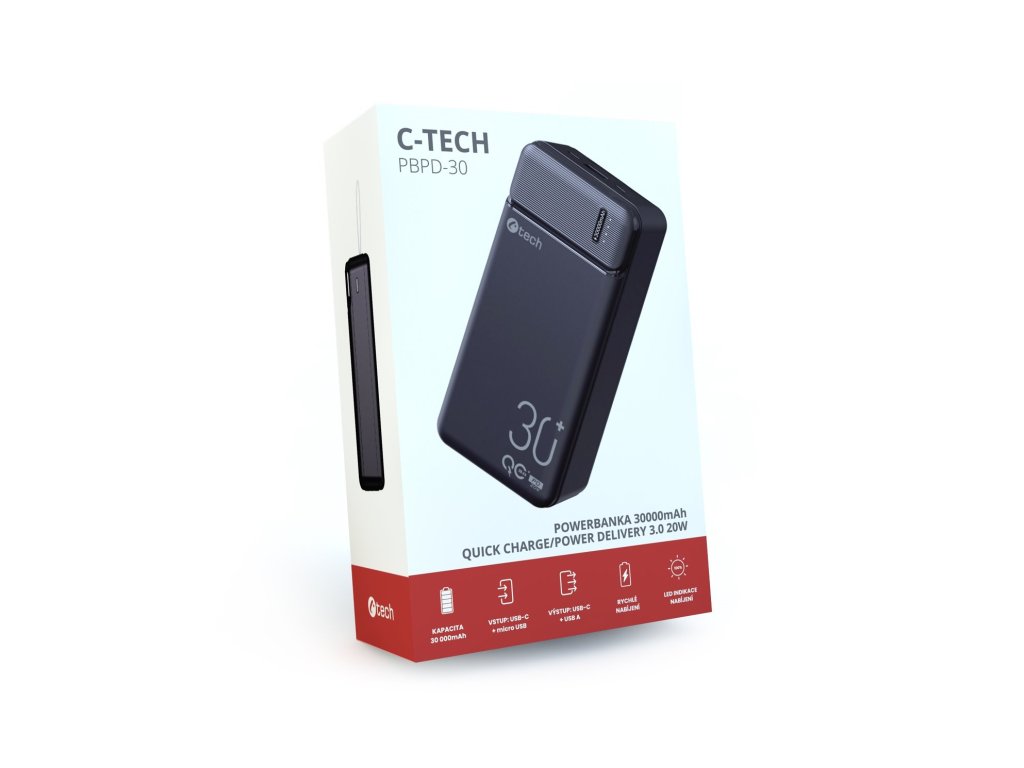 Powerbanka C-tech 30000mAh, Li-Pol, 20W, USB-C/USB-A/micro USB