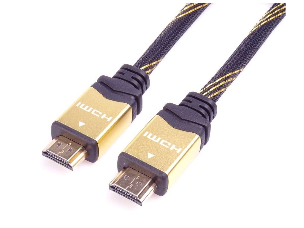 Kvalitní propojovací kabel pro spojení dvou audio/video zařízení přes moderní HDMI rozhraní, jako je např. HD-DVD/BluRay přehrávač a LCD/Plazma televizor. Kabel je stíněný, dokáže přenášet digitální zvuk i obraz a podporuje digitání ochranu obsahu HDCP. Kabel má navíc integrován vysokorychlostní přenos ethernetu. *HDMI 2.0 High Speed kabel + Ethernet kabel *Maximální rozlišení Ultra HD 4K×2K@60hz *Maximální datový přenos: 18 Gb/s *Pozlacené konektory: HDMI typ A (19pinů) male <=> HDMI typ A (19pinů) male *Rozlišení: 3840 × 2160 bodů při 60Hz nebo nižší podporované formáty 1080p FULL HD/1080i/720p/720i *Podporuje : HDMI 2.0 a nižší *Podporuje HDCP 2.2 , Audio Return Channel (ARC) , High Dynamic Range (HDR) *Podporuje: 4K, Deep Color, 3D, xvYCC (xvColor), auto lip-sync, ARC, CEC, HDCP, Dolby TrueHD, HEC *3D video po HDMI připojení *Barevná hloubka: 24-bit *Třívrstvé, vysoce kvalitní stínění *Zpětný audio kanál pro poslání signálu z tuneru TV zpět do domácího kina/surround systému *Přenos počítačové sítě (ethernetu) po HDMI kabelu *19žilový kabel, třikrát stíněný, 100% měděné vodiče AWG30 *Kovové a pozlacené konektory *Kabel potažený nylonovým potahem *Barva černo-zlatá *Balení v PVC sáčku s EAN kódem a popisem, závěsný systém na sáčku *Délka kabelu: 3 mDodatočné parametre