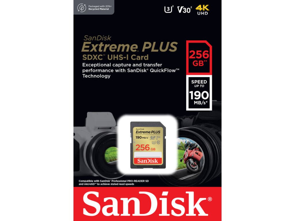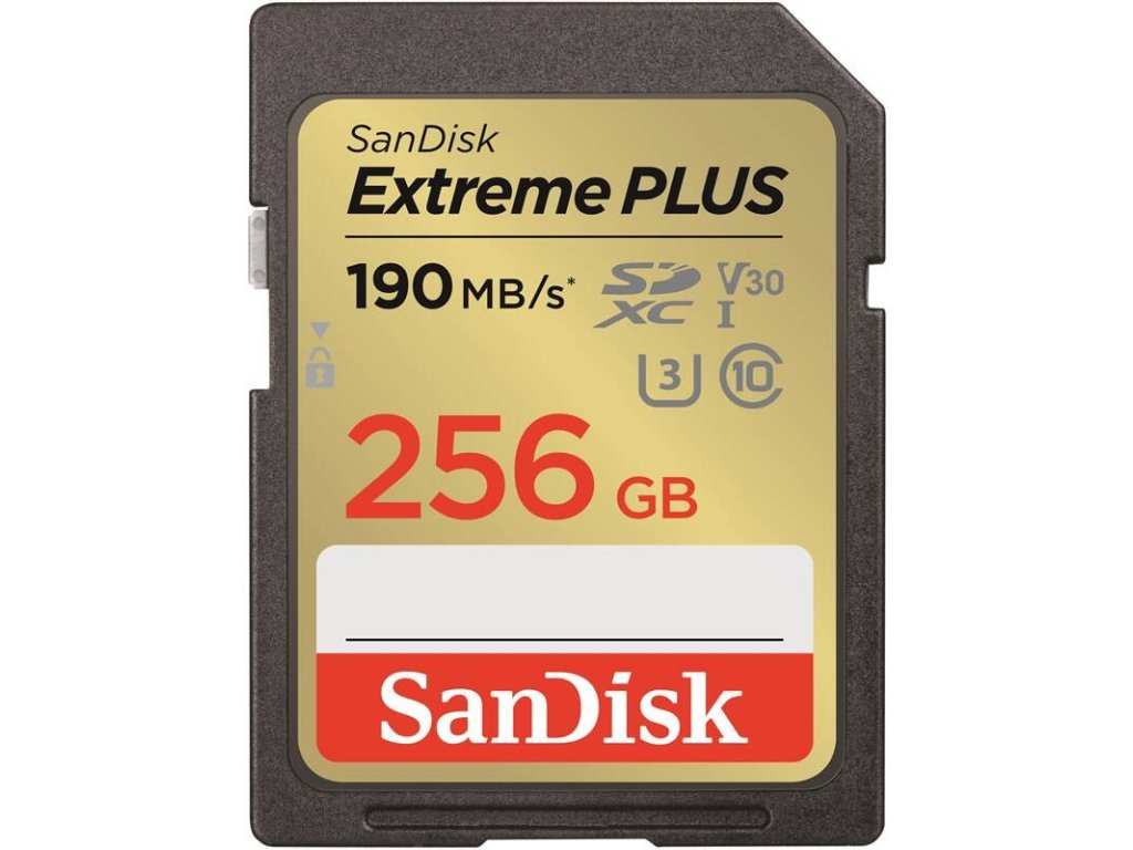 Model: SanDisk Extreme PLUS Provedení: Paměťová karta Kapacita: 256 GB Rozhraní: SDXC Rychlost čtení: 190 MB/s Rychlost zápisu: 130 MB/s Třída rychlosti SD karet: UHS-I, U3, Class 10Dodatočné parametre