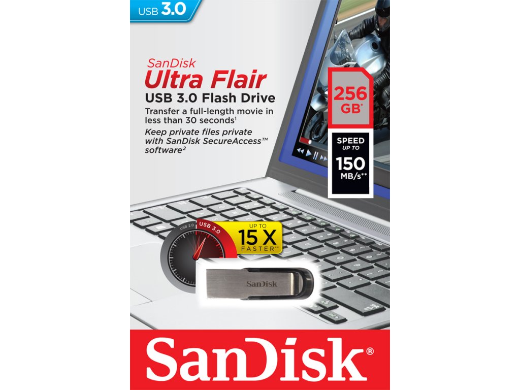 SanDisk Ultra Flair USB™ 3.0 flash disk zajišťuje rychlé přesuny Vašich dat mezi jednotlivými médii, tím zkrátí Vaše čekání. Díky USB 3.0 přenese Vaše data rychleji než standardní USB 2.0. Stylový elegantní kovový design je navržen tak, aby byl dostatečně pevný a odolával nárazům. Umožňuje nastavitelnou ochranu heslem, takže si můžete být jistí, že Vaše data zůstanou soukromá a viditelná je pro Vámi zvolené osoby. Technické detaily: - kapacita 256 GB - USB 3.0 je zpětně kompatibilní s USB 2.0 - přenosová rychlost až 150 MB/s, rychlost zápisu nižší - SanDisk Secure Access software (vyžaduje stažení): chrání vaše soukromé soubory heslem (128-bit AES šifrování) - funkci RescuePRO Deluxe pro obnovu smazaných dat lze stáhnout na www.sandisk.comPřipojení: USB 3.0 A vidlice