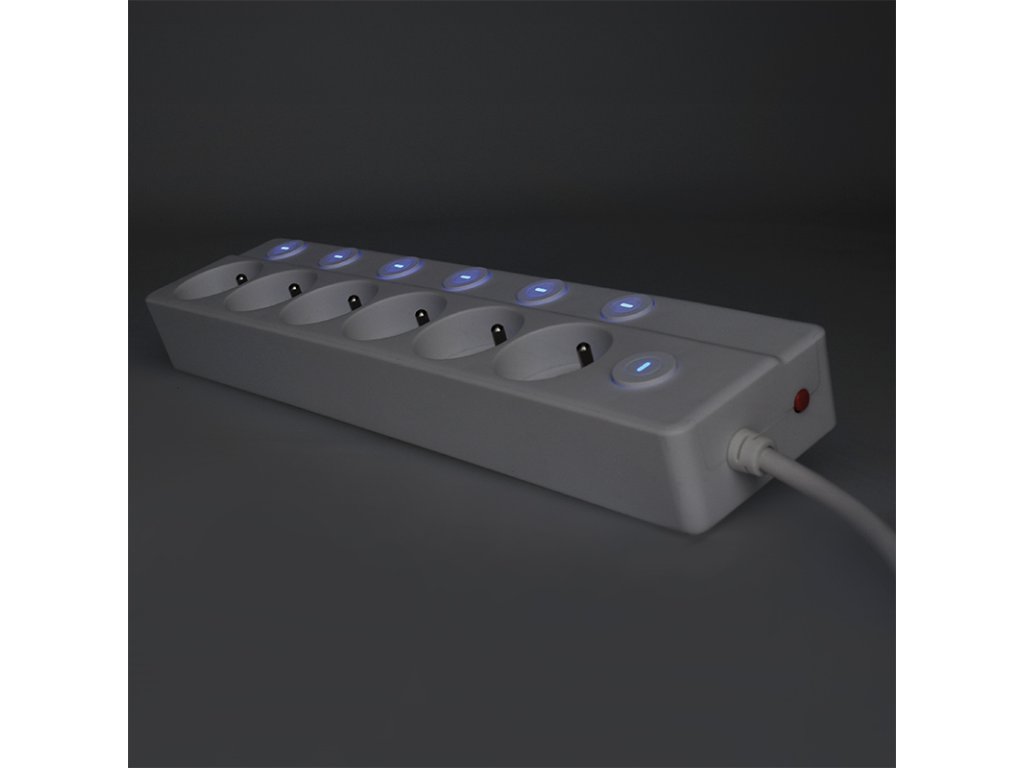 - Prodlužovací prívod so samostatnými vypínačmi pre každú zásuvku. Plus centrálny vypínač ovláda všetky zásuvky naraz. Resetovateľný istič pri preťažení zásuvkového poľa prerušuje napájanie. Potom je možné prodlužovací prívod opäť uviesť do prevádzky.