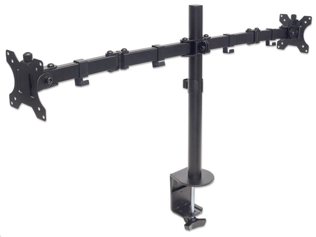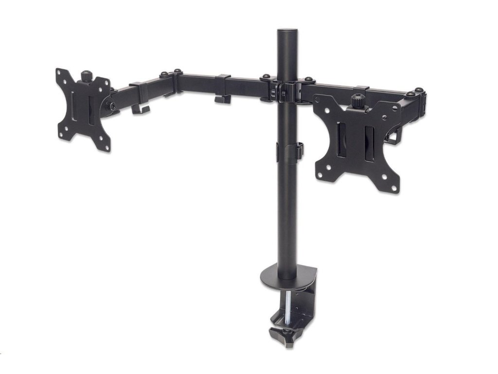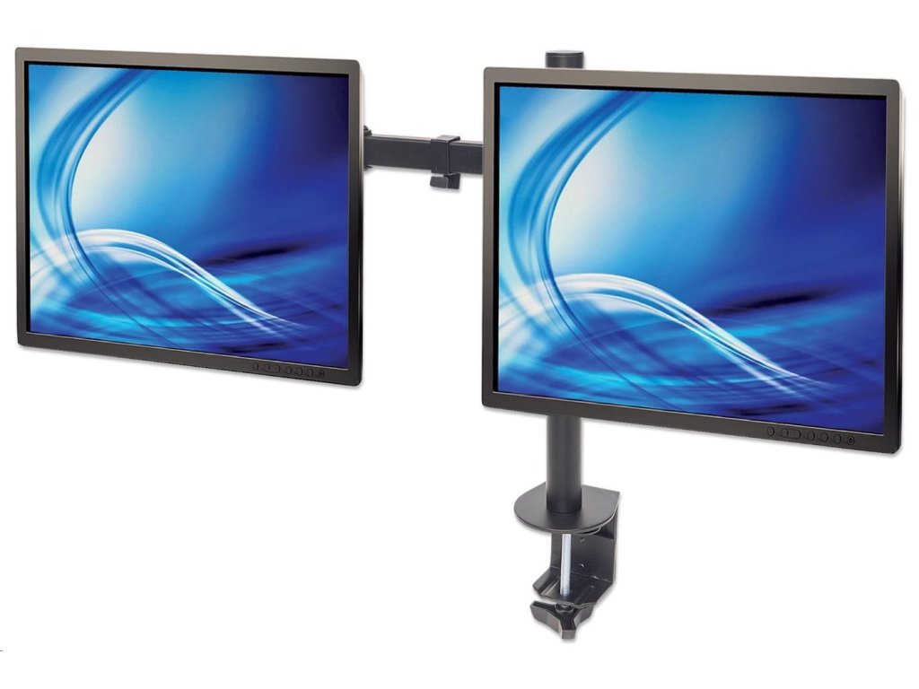 Inštalácia LCD monitora nad pracovný stôl pomáha maximalizovať efektívnosť potenciálneho pracovného priestoru. Univerzálny držiak na dva monitory Manhattan s dvojlinkovým výkyvným ramenom zlepšuje organizáciu na pracovnej ploche a uľahčuje prácu na počítači.