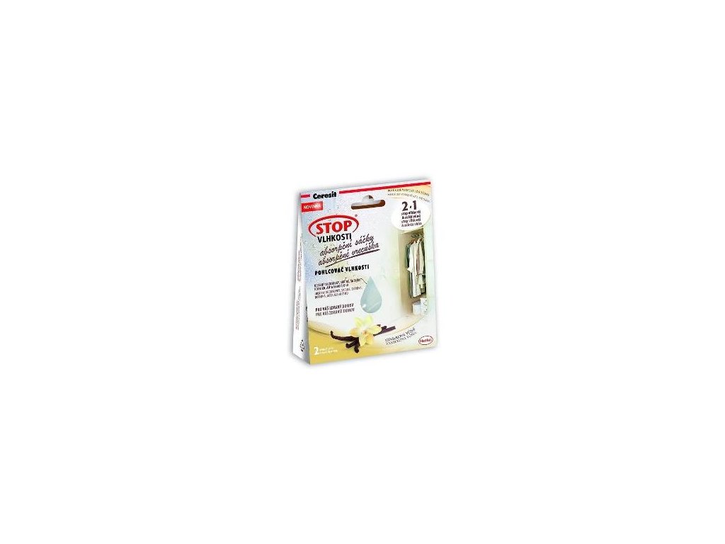 Ceresit Stop Vlhkosti absorpčné vrecúška sú určené do malých priestorov. Kompaktné vrecúško obsahuje 50 g ultra absorpčného granulátu s aktívnymi kryštálikmi. Malý pohlcovač vlhkosti plní dve funkcie: pohlcuje nadmernú vlhkosť a zároveň osviežuje priestor. Je 100% bezpečný. Vďaka špeciálnej technológii sa pohltená vlhkosť premení na gél. Technológia umožňuje vniknutiu vlhkosti do vrecúška a zároveň zabráni jej opätovnému uniknutiu do ovzdušia. Neporušené vrecúško je bezpečné pre kontakt s pokožkou, nábytkom, textíliami. Absorpčné vrecúško odporúčame použiť v priestore s rozlohou 1-2m2. Na väčšiu plochu použite viac vrecúšok. Vrecúško absorbuje vlhkosť po dobu 4-6 týždňov. - pohlcovač vlhkosti vyvinutý pre použitie do menších priestorov ako sú skrine, zásuvky, bielizníky, skrinky na topánky, šatníky,... - stabilizuje vlhkosť ovzdušia v miestnostiach a ostatných priestoroch - chráni bielizeň pred vlhkosťou - zabraňuje vzniku plesni a zápachov - pôsobí preventívne proti výskytu roztočov a baktérií - parfumovaný s vôňou levandule - absorbovaná vlhkosť sa mení vo vnútri vrecúška na gél - funkcia 2 v 1 – pohlcovač vlhkosti a osviežovač vzduchu - maximálna bezpečnosť pri manipuláciiDodatočné parametre