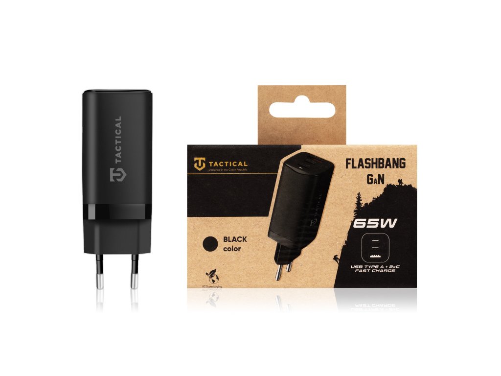 Popis produktu: Dobij noťas, tablet nebo telefon. S Tactical FlasBang GaN 65W už druhou nabíječku potřebovat nebudeš. Gallium Nitride, GaN Technologie, která poskytuje vysoký výkon a zároveň umožňuje zachovat velmi kompaktní rozměry nabíječky. Oproti ostatním nabíječkám má výhodu ve vyšší účinnosti, menších rozměrech a delší životnosti. 65W Celkový výkon nabíječky 65W Ti zaručí, že můžeš nabíjet svůj MacBook, iPad nebo ostatní notebooky a tablety. Výkon 65W není sdílený. To znamená, že na jeden USB-C port utáhneš skutečně celých 65W a neudává jen součet všech portů. Nabíječka celkem disponuje se třemi porty. 2xUSB-C a 1xUSB-A port. Rychlonabíjecí standardy Tactical FlashBang GaN je mistr v univerzálnosti. Podporuje celou škálu rychlonabíjecích standardů. Od PPS, přes PD3.0, QC3.0, Samsung, AFC, Huawei, BC1.2, až po Apple. Neodolatelně odolný U nás v Tactical dbáme na to, aby věci něco vydržely. Proto GaN nabíječka v této kategorii nabízí jen to nejlepší. Při výrobě jsme použili velice odolné materiály a aplikovali nejnovější technologie pro co nejdelší životnost a uživatelskou spokojenost. BE ECO My v Tactical máme rádi přírodu. Všechny naše produkty jsou balené do ECO krabiček z recyklovaného papíru tak, aby co nejméně zatěžovaly životní prostředí. Mysli takticky! KLÍČOVÉ VLASTNOSTI Výkon 65W Podpora rychlonabíjecích protokolů 3 porty 2xUSB-C, 1xUSB-A SPECIFIKACE Maximální výkon: 65W Vstup: 100-240V Výstupy: Type-C1: 65W MAX: PPS: 3.3-11V/3A, PD3.0: 5V3A,9V3A,12V3A,15V3A,20V3.25A Type-C2: 33W MAX: PPS: 3.3-11V/3A, PD 3.0: 5V3A,9V3A,12V2.5A,15V2A,20V1.5A Type-A Output: 30W MAX : 4.5V5A, 5V4.5A , 9V3A,12V2.5A,15V2A,20V1.5A C1+C2: 45W+18W (63W MAX) / C1+A: 45W+18W (63W MAX) /C2+A: 5V 4.8A (24W MAX) C1+C2+A1: 45W+15W (60W MAX) Rychlonabíjecí protokol: PPS, PD3.0, QC3.0, Samsung,AFC, Huawei, Apple, BC1.2 Hmotnost: 122g Barva: černá Co jev balení: Nabíječka Tactical FlashBang GaN, 1x Manuál, Tactical samolepkaDodatočné parametre
