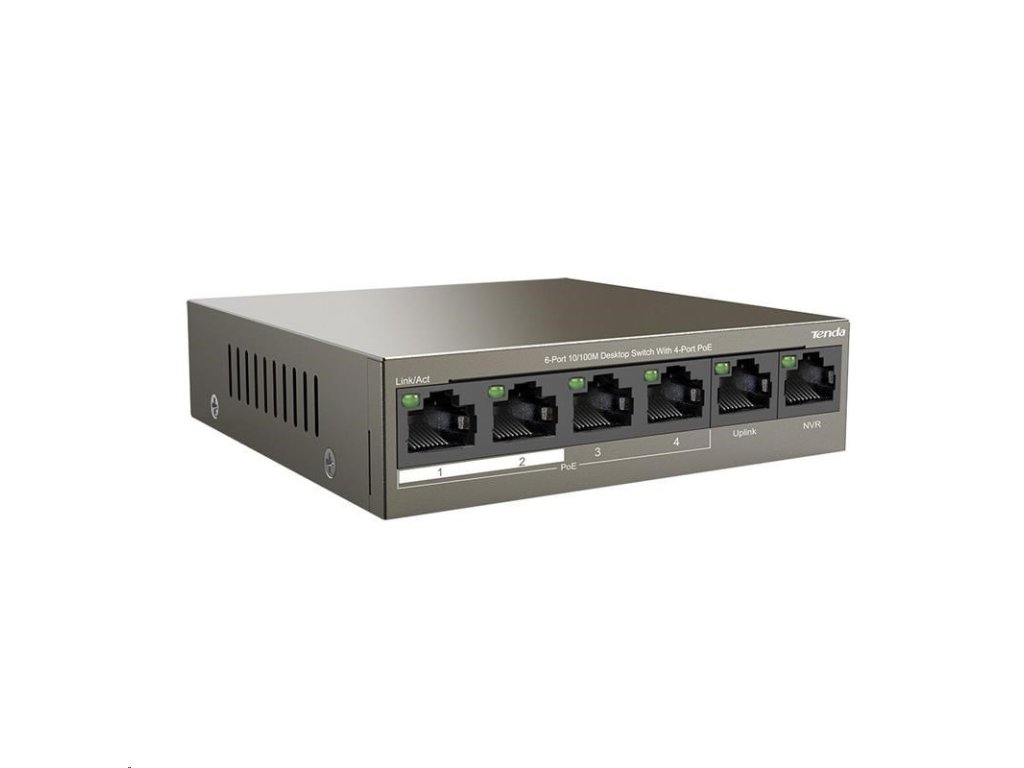 Tenda TEF1006P-4-63W prepína dáta pomocou 6 portov RJ45 s rýchlosťou 10/100 Mb/s s automatickou detekciou rýchlosti. Dva porty slúžia ako Uplink a 4 porty PoE podporujú PoE 802.3af a 802.3at. Prepínač podporuje stabilné 8-jadrové napájanie PoE, 6kV prepäťovú ochranu. Podpora prepínania uzlov typu Store-and-Forward. Plne duplexné riadenie toku 802.3x, poloduplexné riadenie toku v režime Back-Pressure. Dva porty Uplink možno použiť na pripojenie prepínača k sieti a druhý na pripojenie iného zariadenia bez PoE, napr. NVR a ďalšie.
