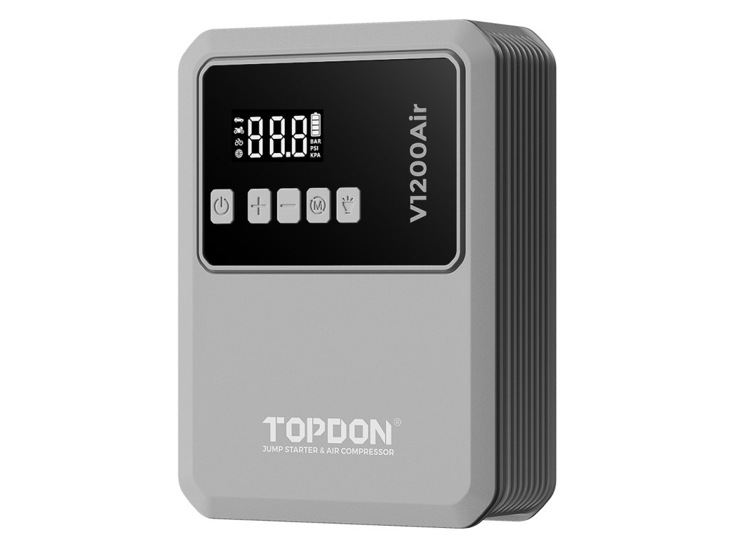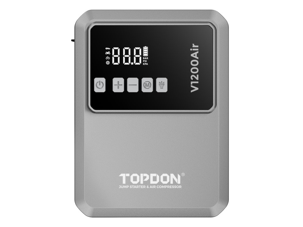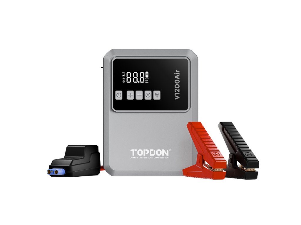 TOPDON Car Jump Starter JumpSurge V1200 Air – startovací zdroj a kompresor v jednom TOPDON V1200 Air je multifunkční zařízení, které vám ušetří místo v kufru i starosti na cestách. Díky startovacímu proudu 1200 A spolehlivě nastartuje 12V vozidla – osobní auta, motorky, SUV i menší dodávky. Už se nemusíte obávat vybitých baterií, protože pomoc je vždy po ruce. S podporou motorů až do 6,0 l benzínu nebo 4,5 l nafty vám V1200Air umožní jednoduše vyrazit během několika minut.