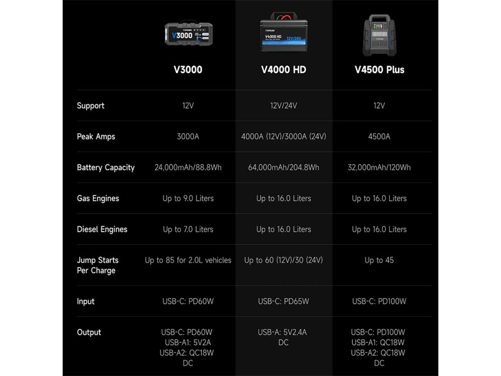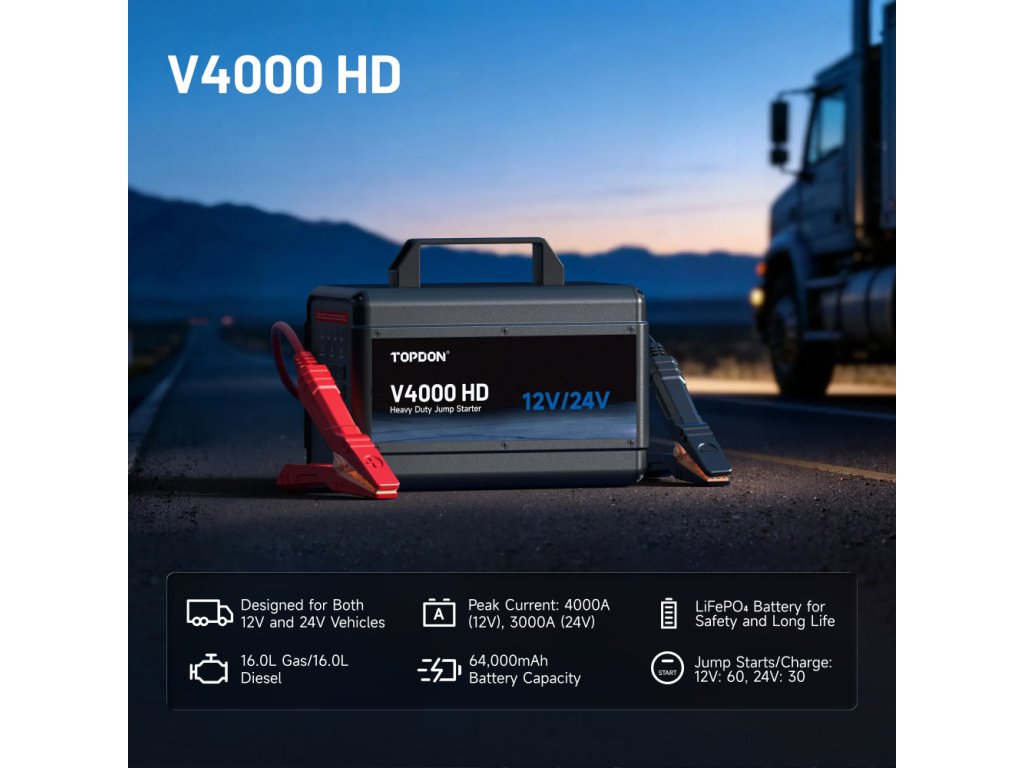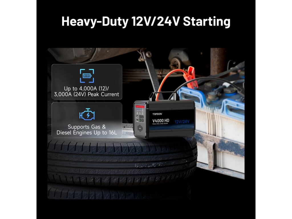TOPDON V4000HD - profesionální 12V/24V startovací zdroj pro osobní a nákladní vozidla TOPDON V4000 HD je špičkový startovací zdroj navržený pro nestandartní podmínky. Tento profesionální model zvládá 12V i 24V systémy a je určen nejen pro osobní automobily, ale také pro nákladní vozy, autobusy, stavební techniku a těžká pracovní vozidla. Díky maximálnímu startovacímu proudu až 4000 A (12V) a 3000 A (24V) bez problémů nastartuje benzínové i dieselové motory až do objemu 16 litrů.