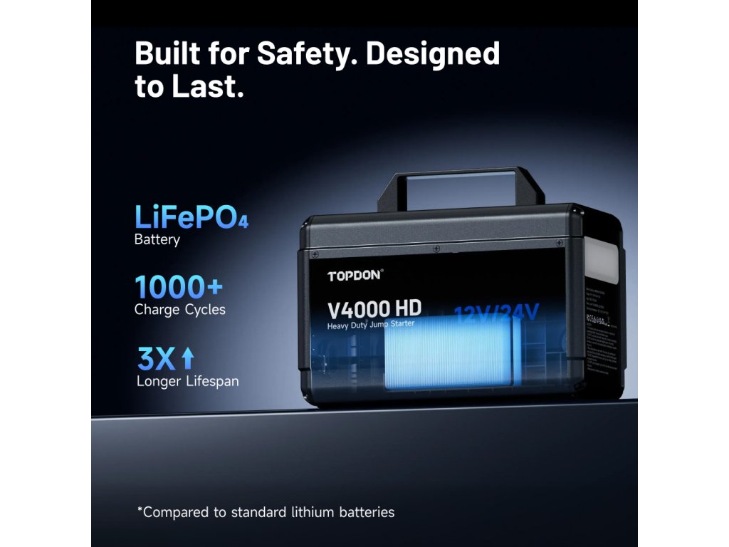 Extrémní výkon bez kompromisů V4000 HD s bezpečnou LiFePO4 baterie s kapacitou 64 000 mAh (204,8 Wh). Ta poskytuje dostatek energie pro opakované starty – až 60 startů u 12V vozidel nebo 30 startů u 24V systémů na jedno nabití. Tento výkon z něj dělá ideální řešení pro autoservisy, odtahové služby i profesionální techniky v terénu.