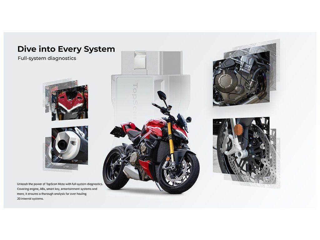 Ponořte se do každého systému Uvolněte sílu systému TopScan Moto s diagnostikou celého systému. Zahrnuje motor, ABS, inteligentní klíč, zábavní systémy a další a zajišťuje důkladnou analýzu pro generální opravu 20 vnitřních systémů. Komplexní přístup zajišťuje přesné řešení problémů.