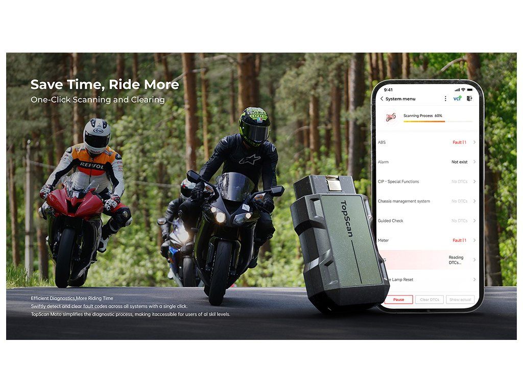 Šetřete čas, jezděte více Jedním kliknutím rychle zjistíte a vymažete chybové kódy všech systémů. TopScan Moto zjednodušuje diagnostický proces, zpřístupňuje jej uživatelům všech úrovní dovedností a zvyšuje celkový uživatelský komfort.
