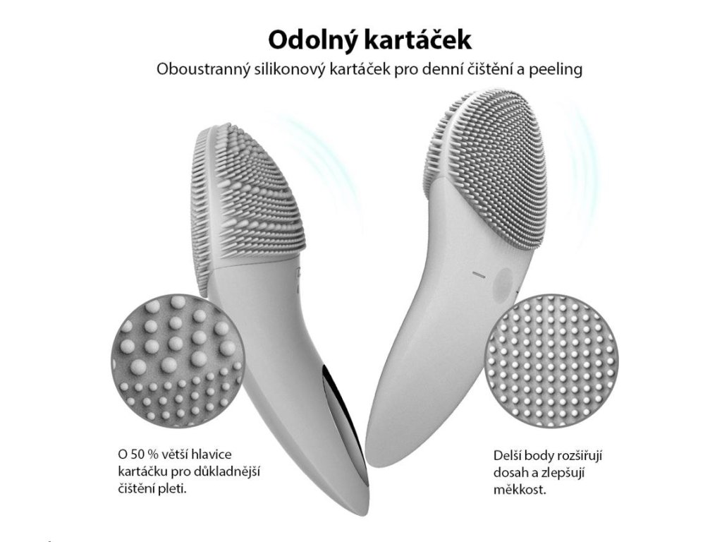 Každodenná čistiace plocha je vybavená jemnými silikónovými dotykovými bodmi, ktoré čistia tvár bez poškodenia pokožky.