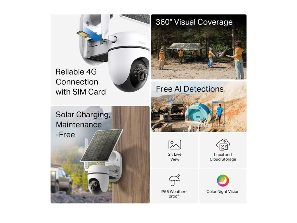| Package Content | Tapo C615G Kamera Tapo A201 Solárny panel × 1 Držiak solárneho panelu Tapo A201 × 1 Základná krytka × 1 Odomydateľná anténa × 1 USB adaptér kábel × 1 Prídavný kábel × 1 Montážne skrutky a hmoždinky Montážne šablóny nalepovacie samolepky × 2 Rýchly návod na použitie |