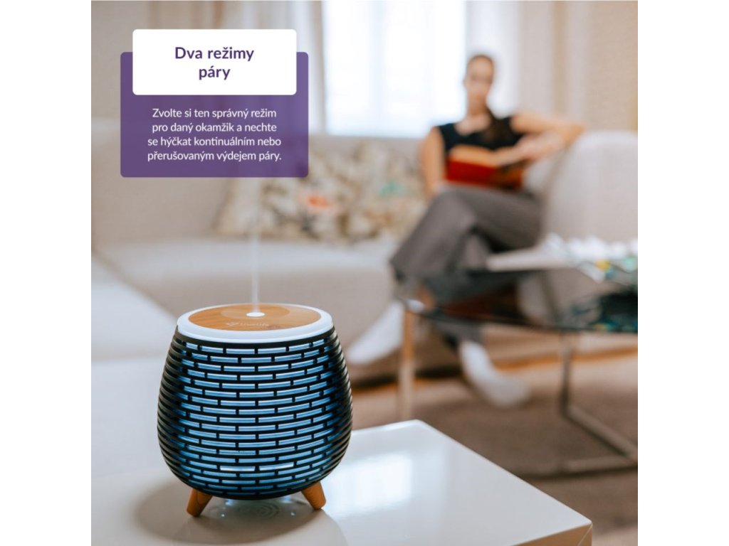 Aromaterapeutická funkcia difuzéra prináša mnoho benefitov pre telo i myseľ a veľmi pozitívne účinky má aj ako zvlhčovač vzduchu. Naplňte ho iba vodou a para zvlhčí miestnosť na optimálnu hodnotu, aby sa vám lepšie dýchalo. Zvlhčený vzduch pomáha aj pri problémoch s astmou, suchou pokožkou a ekzémami. Keď voda klesne pod minimálnu hranicu, difuzér sa automaticky vypne, takže ho bez obáv môžete nechať pustený aj počas spánku.