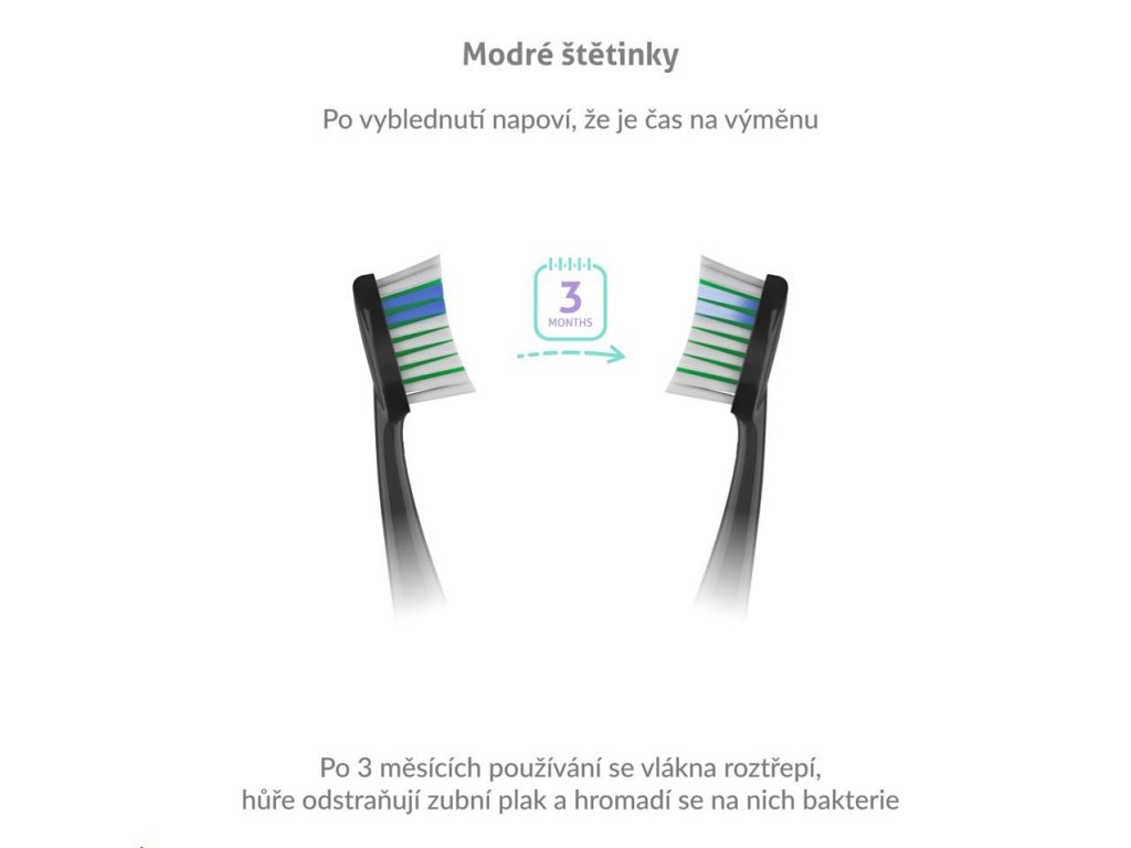 Hlavice vydržia až 3 mesiace používania, potom sa začnú tierať, strácajú účinnosť a navyše sa na nich hromadia baktérie. Našťastie sú hlavice vybavené modrými štetinkami, ktoré po 3 mesiacoch vyblednú a tak viete, že je načase hlavice vymeniť.