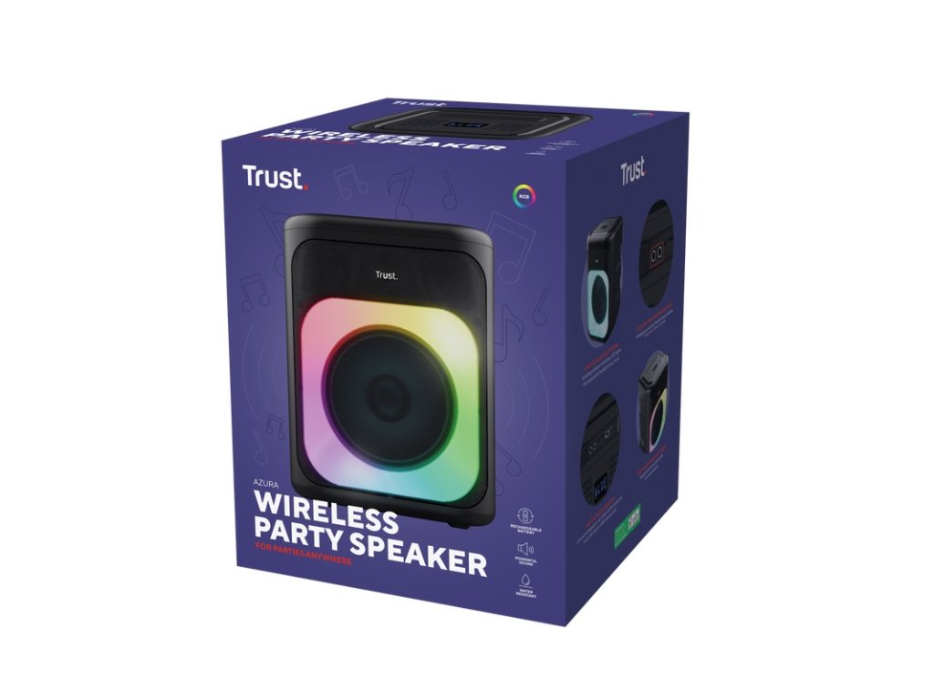 Trust Azura bezdrátový party reproduktor Bluetooth® s podsvícením RGB * výkonný zvuk s výstupním výkonem 50W, abyste si mohli vychutnat svou oblíbenou hudbu * 4 varianty LED včetně duhových vícebarevných LED žárovek, které reagují na rytmus hudby * přenosný, s vestavěnou rukojetí, díky které si ho můžete vzít kamkoli s sebou * bezdrátový dosah až 10m díky Bluetooth® připojení reproduktoru * dobíjecí baterie až pro 11 hodin nepřetržité zábavy * možnost připojení libovolného audio zařízení přes Bluetooth® nebo 3,5mm konektor AUX * kryty s odolností vůči vlivům počasí třídy IPX4 chrání tlačítka a vstupy před vlhkostí * snadno dostupná ovládací tlačítka pro hlasitost, předchozí/následující skladbu, přehrávání/pozastavení a osvětlení umožňují vyladit si poslech podle vlastních představ * na pohodlném LCD displeji rychle vidíte, jaký vstup je použit * TWS párování umožňuje spárovat 2 party reproduktory současně - získáte tak větší hlasitost a stereo zvuk * 2x vstup pro mikrofon, abyste si mohli s přáteli užít zábavu při karaoke Technické parametry Frekvenční rozsah: 100Hz-20kHz Impedance: 4 Ohmy Výstupní výkon (RMS): 50W Měnič: 160mm Rozhraní: Bluetooth, USB-A, 3,5mm, mic, microSD Typ připojení: bezdrátové, drátové Audio kodek: mp3, wma, wav, flac Podsvícení: RGB Napájení: USB-C (odnímatelný kabel) Barva: černá Rozměry: 310x235x220mm Hmotnost: 3,8kg Požadavky na systém: * zařízení s připojením Bluetooth * USB nabíječka Obsah balení: * party reproduktor * nabíjecí kabel USB-C * uživatelská příručka Záruka: 2 roky Odkaz na stránku výrobce: https://www.trust.com/en/product/25280-azura-wireless-party-speakerDodatočné parametre