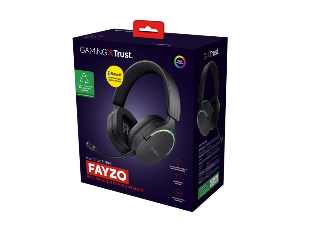 Trust Gaming GXT 491 Fayzo výkonná herní bezdrátová sluchátka pro pohlcující herní zážitek * virtuální prostorový zvuk 7.1 vás dokonale přenese přímo do hry * ekologické provedení - vyrobeno z 85% z recyklovaných plastů * až 30 hodin nepřetržitého hraní na jedno nabití * extra silné měkké náušníky poskytují hodiny komfortu při hraní * odnímatelný mikrofon s potlačením šumu vám usnadní zřetelnou komunikaci * snadno přístupné ovládání hlasitosti na uchu a ztlumení mikrofonu, abyste slyšeli a byli slyšet, jen když chcete * nastavitelné osvětlení RGB * součástí balení je 1,2m opletený odpojitelný kabel s 3,5mm konektorem pro připojení k dalším zařízením Technické parametry Měnič: 50mm neodymový Frekvenční rozsah: 20Hz-20kHz Impedance: 32 Ohmů Citlivost: 100dB Hladina akustického tlaku: 110dB Mikrofon: odnímatelný Audio kodek: SBC Podsvícení: RGB Rozhraní: USB-A, 3,5mm, Bluetooth Typ připojení: drátové, bezdrátové Délka kabelu: 1,2m Barva: černá Rozměry: 200x180x90mm Hmotnost: 290g Kompatibilní typy zařízení: herní konzole (PS, Nintendo Switch), notebook, pc, tablet, mobil Požadavky na systém: volný port USB, Windows, macOS, Chrome OS Obsah balení: * herní sluchátka * USB přijímač * mikrofon * pop filtr * 1,2m audio kabel * 1m nabíjecí kabel USB-A na USB-C * návod k použití Záruka: 2 roky Odkaz na stránku výrobce: https://www.trust.com/en/product/24901-gxt-491-fayzo-wireless-gaming-headsetDodatočné parametre