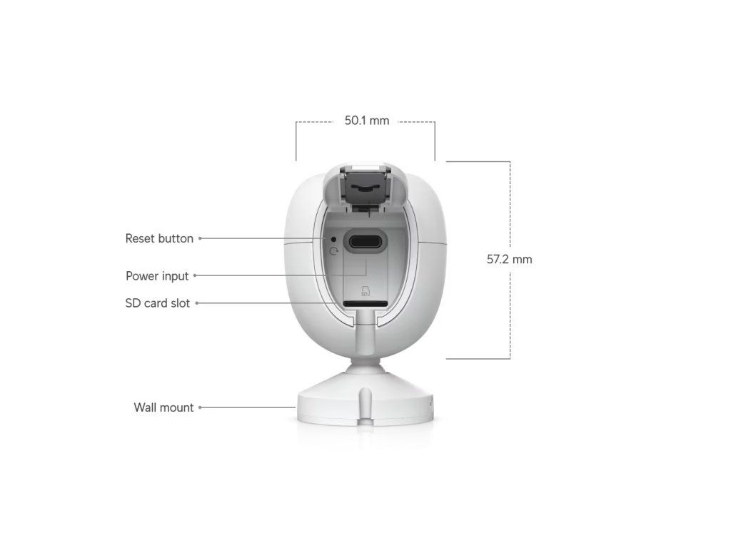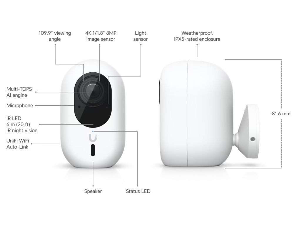Technické specifikace Rozměry: 81,7 × 50,1 × 57,2 mm IR noční vidění: 6 m Rozpoznávání tváře: Ano Rozpoznávání registračních značek: Ano Chytrá detekce (lidé, vozidla, zvířata): Ano Rozlišení: 4K Zorné pole: H: 109,9°, V: 56,7°, D: 134,1° Audio: Obousměrný zvuk Odolnost vůči povětrnostním vlivům: IPX5 Odolnost proti neoprávněné manipulaci: IK04 Montáž: Příslušenství pro montáž na zeď Správa: UniFi Protect