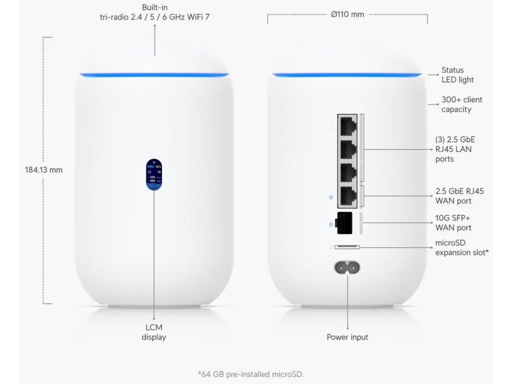 Popis produktu UniFi Dream Router 7 od Ubiquiti je řešení sítě vše v jednom pro domácnosti a malé kanceláře. Jedná se o výkonné zařízení se 4-jádrovým CPU, 3 GB RAM, které kombinuje Router, WiFi 7 AP, 3-portový 2.5G switch s možností 802.3af PoE na jednom portu. Pro připojení do sítě disponuje 2.5G WAN portem a 10G SFP+ WAN portem. Router má předinstalované aplikace UniFi Network/Protect/Access/Talk a microSD slot, který slouží jako uložiště pro kamerové záznamy (64GB SD karta součástí balení). Pomocí UniFi network dokáže spravovat dalších 30+ zařízení z řady UniFi a pro UniFi protect umožňuje nahrávat 1x 4K kameru, 2x 2K kamery nebo 5x HD kamer. Třešničkou na dortu tohoto elegantního routeru je malý displej pro zobrazení aktuálního síťového provozu. Vestavěné Tri-Band WiFi 7 AP podporuje nejnovější standard 802.11be s modulační rychlostí až 5,7 Gbps v 6GHz pásmu, až 4,3 Gbps v 5GHz pásmu a až 688 Mbps ve 2.4 GHz pásmu a šifrování WPA3. Klíčové vlastnosti • Tri-Band WiFi 7 AP s podporou 802.11a/b/g/n/ac/ac/ax/be • 5,7 Gbps (6GHz) + 4,3 Gbps (5GHz) + 688 Mbps (2,4GHz) • (1) 10G SFP+ WAN + (1) 2.5G WAN + (3) 2.5G LAN - 1 port s podporou PoE-out (802.3af) • PoE budget 15,4W • Slot na MicroSD karty pro ukládání záznamů z UniFi Protect (64GB SD karta součástí balení) • 0.96" LCD barevný displej pro zobrazení síťového provozu a vytížení • Předinstalované UniFi aplikace Network, Protect, Access, Talk, Connect Obsah balení • Zařízení • 64GB MicroSD karta • Napájecí kabel • Nástroj na vyjmutí microSD karty Technické parametry Bezdrátové vlastnosti Bezdrátové frekvence:2.4 + 5 + 6 GHz (triple band) WiFi standardy:802.11n, 802.11a, 802.11ac, 802.11b/g, 802.11ax, 802.11be MU-MIMO:Ano Přenosová rychlost - 5GHz [Mb/s]:4300 Přenosová rychlost - 2.4GHz [Mb/s]:688 Přenosová rychlost - 6GHz [Mb/s]:5700 Vysílací výkon 2.4GHz [dBm]:23 Vysílací výkon 5GHz [dBm]:26 Vysílací výkon 6GHz [dBm]:24 Šifrování:WPA, WPA2, WPA3 2.4GHz MIMO:2 x 2 5GHz MIMO:2 x 2 6GHz MIMO:2 x 2 Typ antény:Vestavěná Roaming:Ano Zisk antény [dBi]:6, 7, 5 Konektory a rozhraní Rychlosti WAN:(1) 10/100/1000/2500Mbps + (1) 10Gbps SFP+ Možnost více WAN:Ano Rychlost LAN:(3) 100/1000/2500Mbps Gigabit LAN:Ano Optické rozhraní:(1) 10Gbps Ostatní:LCD displej Napájení Typ napájení:Ze sítě (230V) Typy PoE:PoE-Out (pouze) Podporované PoE-Out standardy:802.3af Počet PoE Out portů:1 Max. spotřeba energie [W]:26 Fyzické charakteristiky Provedení:Desktop Použití:Vnitřní Šasi:Plastové Tlačítka:Reset Provozní teplota [°C]:-10 až 40 Hmotnost [g]:1100 Šířka [mm]:110 Výška [mm]:184 Hloubka [mm]:110 Hardware CPU:ARM Cortex-A53 Frekvence CPU [MHz]:1500 Počet CPU jader:4 RAM [MB]:3072 Software Podporované VPN:L2TP, IPSec, OpenVPN, WireGuard Předinstalovaný kontroller:UniFi Network, UniFi Protect, UniFi Talk, UniFi Access, UniFi Connect Operační mód:AP Router Management:UniFi Network, Mobilní aplikace Podpora IPv6:AnoDodatočné parametre