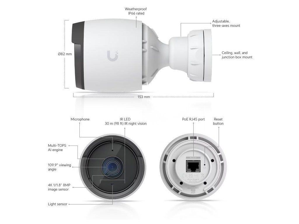 Popis produktu UniFi G6 Bullet kamera disponuje 8MP snímačem s rozlišením 3840 x 2160 při 30fps a objektivem s pozorovacím úhlem 109.9°, který je vybaven IR přísvitem pro noční vidění do vzdálenosti 30m. Dále je kamera vybavena mikrofonem pro záznam zvuku, 10/100 Mbps LAN portem s podporou PoE a stupněm krytí IP66 pro použití ve venkovním prostředí. Díky držáku jste schopni obraz směrovat ve všech 3 osách. Kameru je možné napájet pouze prostřednictvím PoE adaptéru nebo switche podporující standard 802.3af a pasivní PoE (36-57V DC). Maximální spotřeba kamery je 9,9W! AI funkce Díky implementaci AI kamera podporuje pokročilé detekce jako jsou detekce obličeje, detekce SPZ nebo chytré rozpoznání objektů (osoba, vozidlo, zvíře). Důležité vlastnosti • 8MP, 30 FPS video • AI chytré detekce • Noční režim s IR LED diodami • IP66 kryt odolný proti povětrnostním vlivům • Vestavěný mikrofon • Spravováno softwarem UniFi Protect • Odolnost vůči vandalům - IK04 Obsah balení • Zařízení • Šroubky + hmoždinky • Držák pro přichycení ke zdi • Kovová spona Technické parametry Kamera Typ objektivu:Fixní Přísvit:IR Dosah přísvitu [m]:30 Pozorovací úhel [°]:110 Režim den/noc:IR cut filtr Obrazový senzor ["]:1/1.8 Obraz Rozlišení:8MP Max. rozlišení [pixely]:3840 x 2160 (4K UHD) Konektory a rozhraní Audio:Mikrofon Rychlost LAN:(1) 10/100Mbps Napájení Napájení přes PoE:802.3af, 37 .. 57V DC Typ napájení:PoE Max. spotřeba energie [W]:9,9 Fyzické charakteristiky Stupeň krytí:IP66 Použití:Venkovní Antivandal (ochrana proti nárazu):IK4 Tlačítka:Reset Provozní teplota [°C]:-20 až 50 Hmotnost [g]:737 Šířka [mm]:82 Výška [mm]:82 Hloubka [mm]:153 Barva:Bílá Obecné Kamerová řada:UniFi ProtectDodatočné parametre