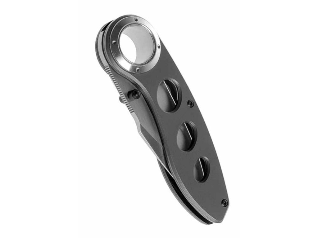 Dizajnovo veľmi zaujímavý kúsok celokovového Vreckového noža UMAX R8. Svojim tvarom pripomína bojový nôž. Z chrbtovej časti pri rukoväti je jemné zúbkovaná čepeľ. Nôž možno otvoriť jednou rukou pomocou bočných kolíkov. Poistka klasická zo spodu noža (Liner Lock). Tento poistný systém je najviac používaný a ideálny pre každého.