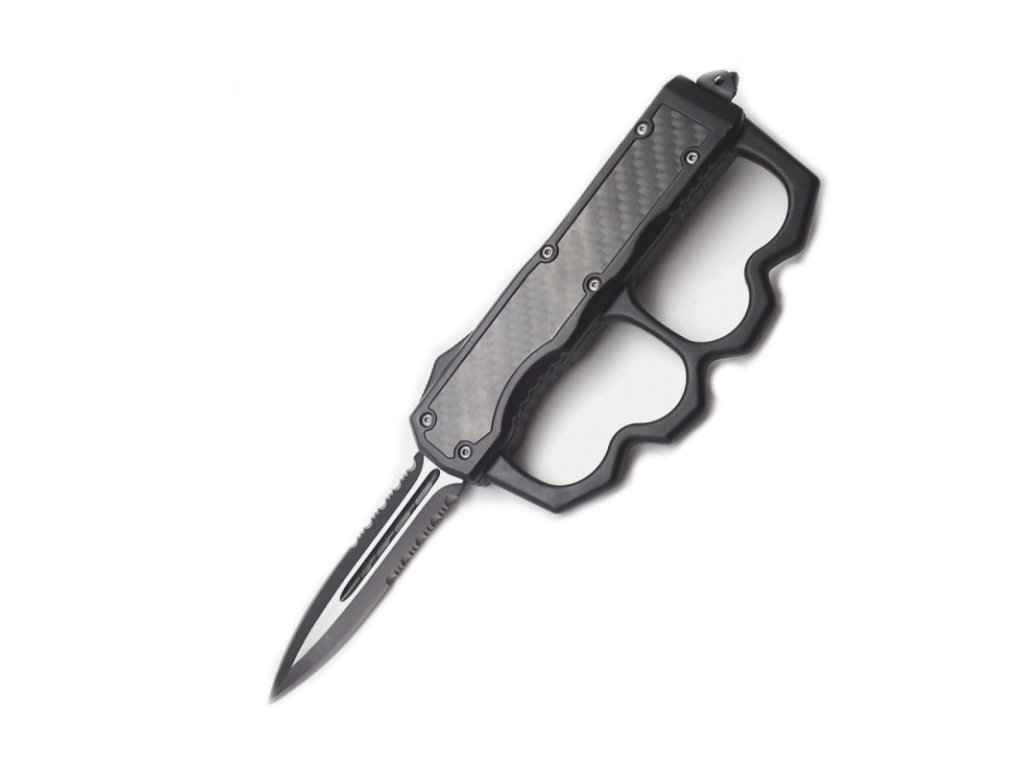 Celokovový vyskakovací nôž priamy. Elegantný kúsok s boxerom. Pevné celekovové prevedenie s celkovou váhou 290g. Čepel je obojstranná s kombinovaným ostrím (zúbkované + hladké). Nôž obsahuje pevnú pracku s možnosťou uchytenia o opasok. Výsuvné tlačítko sa nachádza na boku. Potiahnutím smerom dopredu nôž vystrelí a následne potiahnutím k sebe sa čepel schová naspäť.