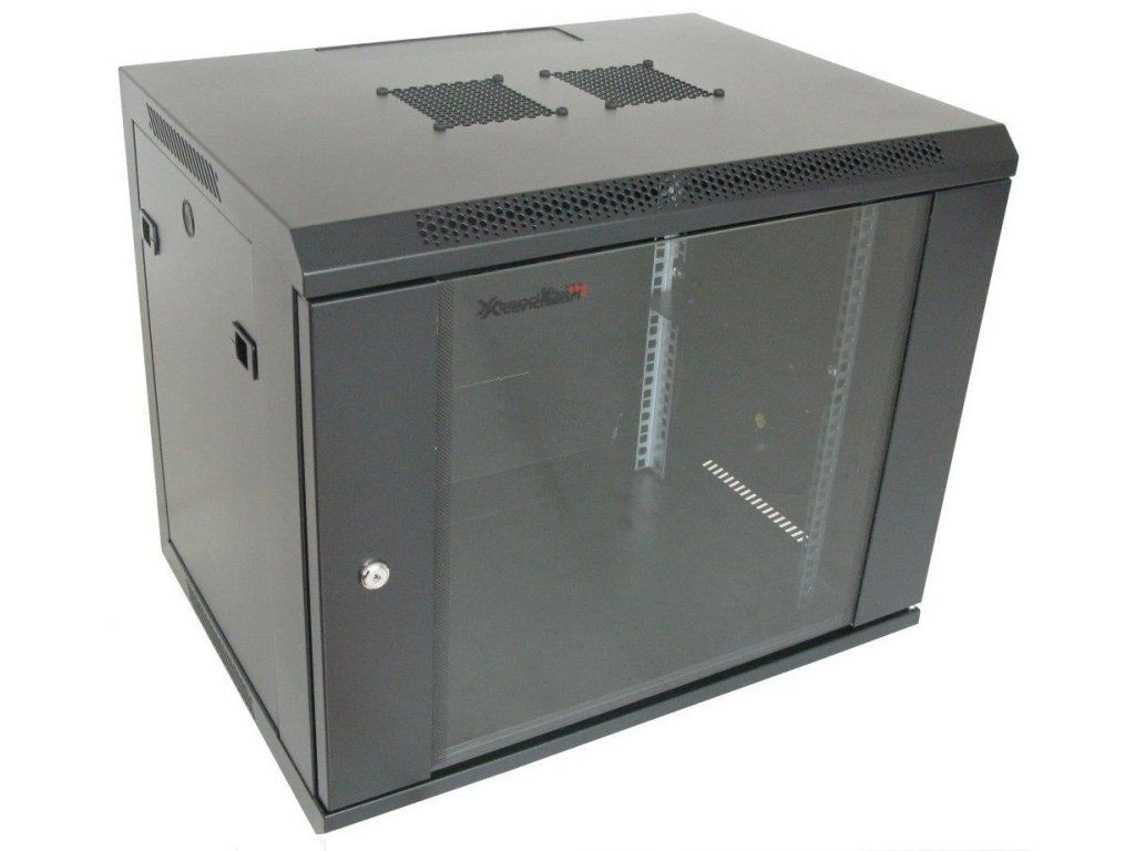 XtendLan 19" nástěnný rozvaděč 12U 600x600, nosnost 60 kg, skleněné dveře, rozložený, černý