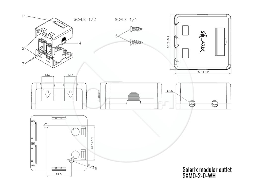Solarix SXMO-2-0-WH Zásuvka modulární pro 2 keystony na omítku, bílá Vlastnosti *Modulární zásuvka: Pro keystony 2 × RJ45 *Kompatibilita: Se všemi keystony Solarix řady -SA a -NA *Instalace: Velmi jednoduchá a rychlá montáž na omítku *Ochrana portů: Port je chráněn protiprachovou krytkou *Kabelový vývod: Pro kabely o průměru do 8,5 mm, umístěn na horní straně zásuvky *Příslušenství: Součástí balení jsou moduly k barevnému odlišení portů v červené a modré barvě *Označení: Na zásuvce je vyměnitelný označovací štítek *Barva: Bílá Záruka 5 letDodatočné parametre